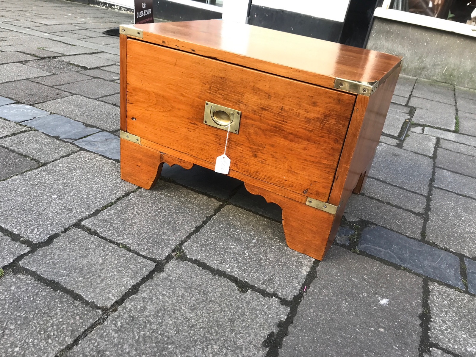 This is an unusual Victorian antique pine low one draw chest / table with brass corner mounts.