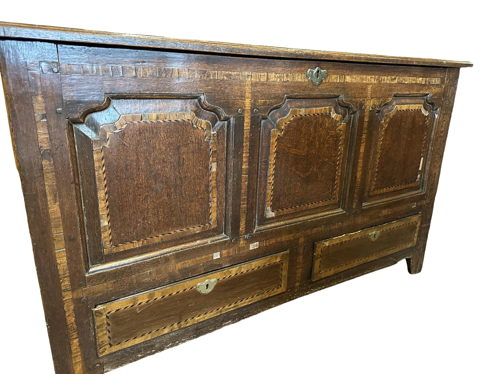 18th century oak antique trunk/coffer with draws. All fielded panels and draws have cross banding as well as the carcass. This genuine antique is in original unrestored condition and fantastic value at £495 including uk delivery