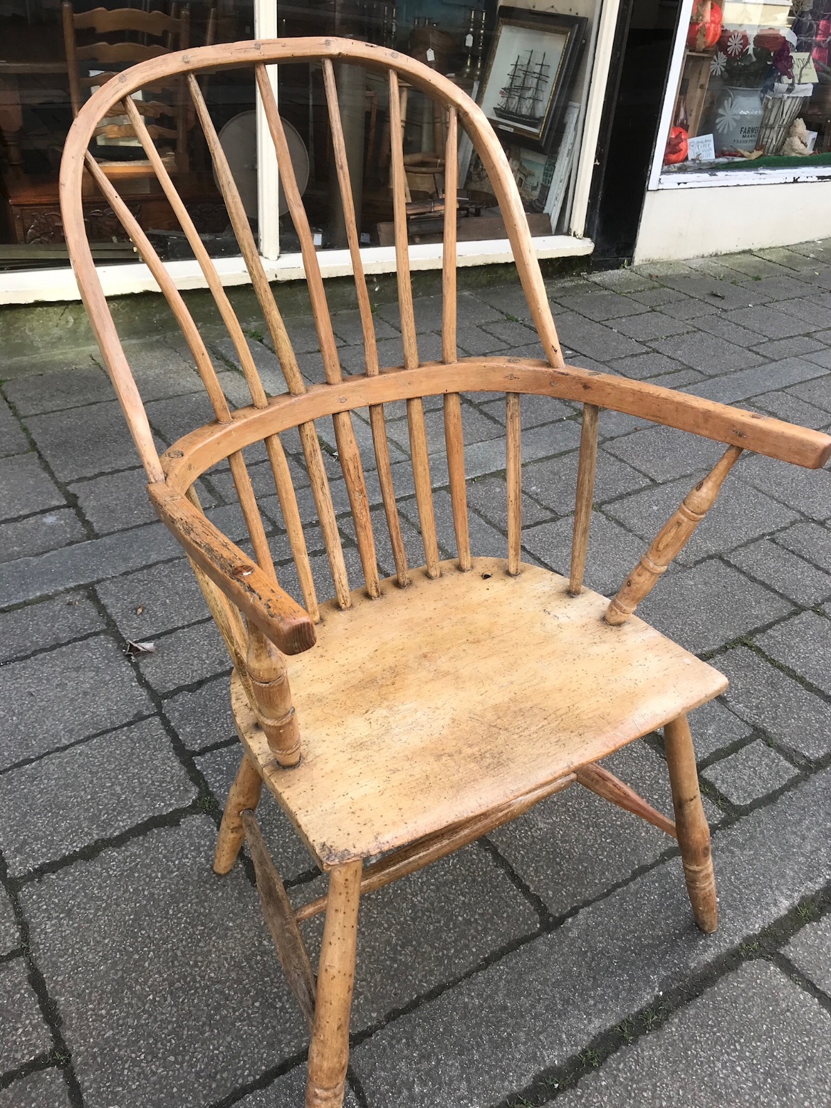 18th century Early Cornish Windsor armchair with sycamore seat and one replacement rear leg.