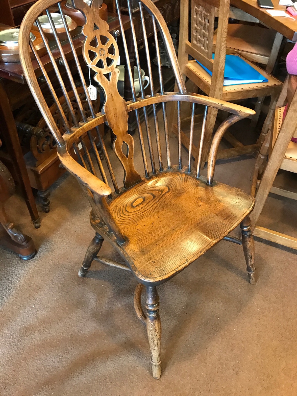 Offered for sale is this 18th Century antique Windsor elm & ash original wheelback armchair with crinoline stretcher.