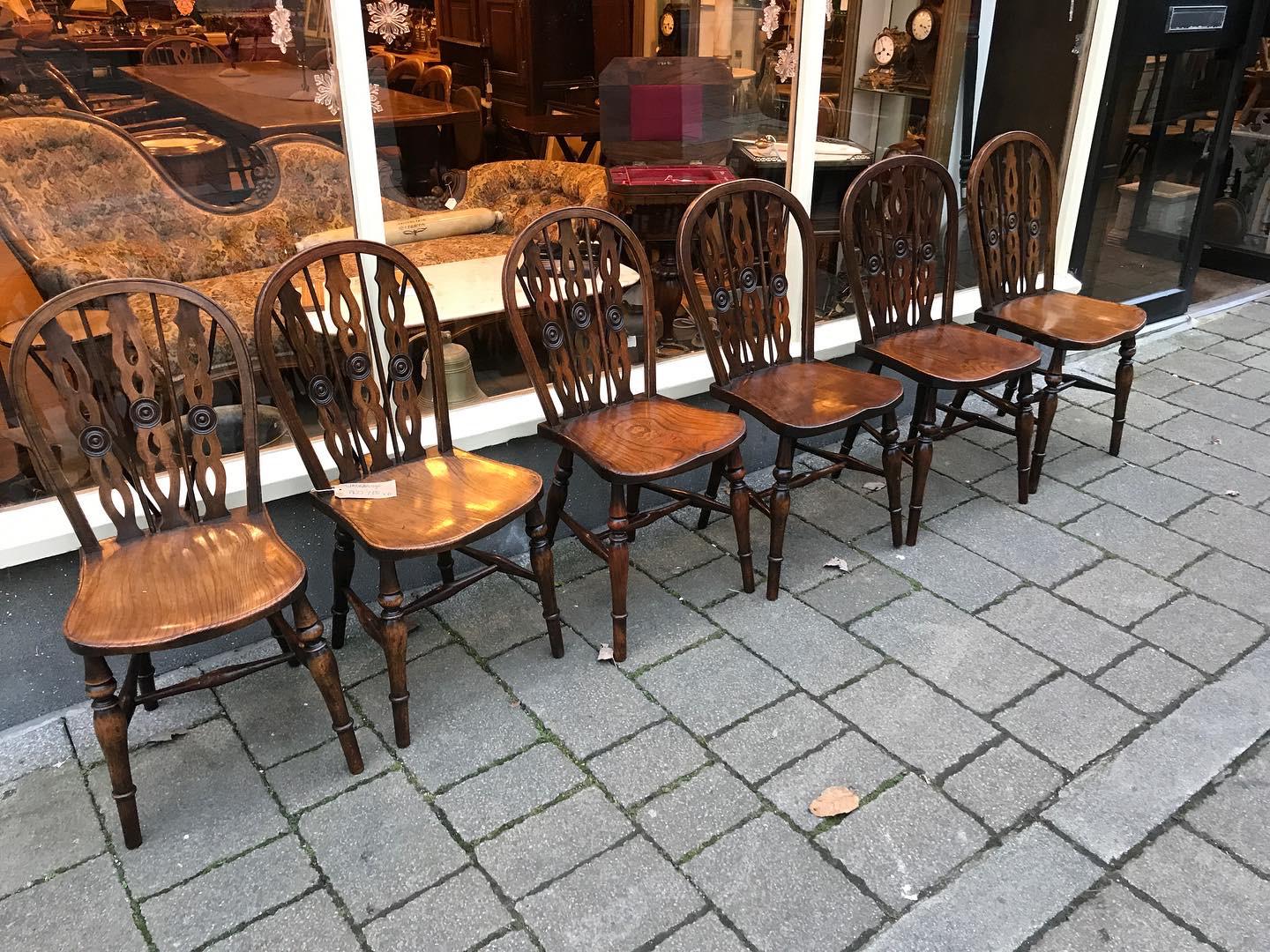 Lovely quality 19th Century antique elm and ash country Windsor chairs with cross stretcher base and fishtail backs for extra support. The chairs have a three shaped splats with carved bullseye design.