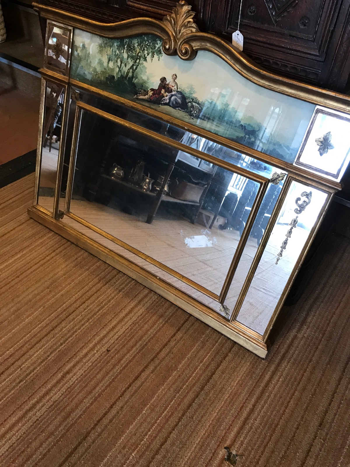 Nice four plate margin mirror with with landscape design art work at the top of the shaped top section.