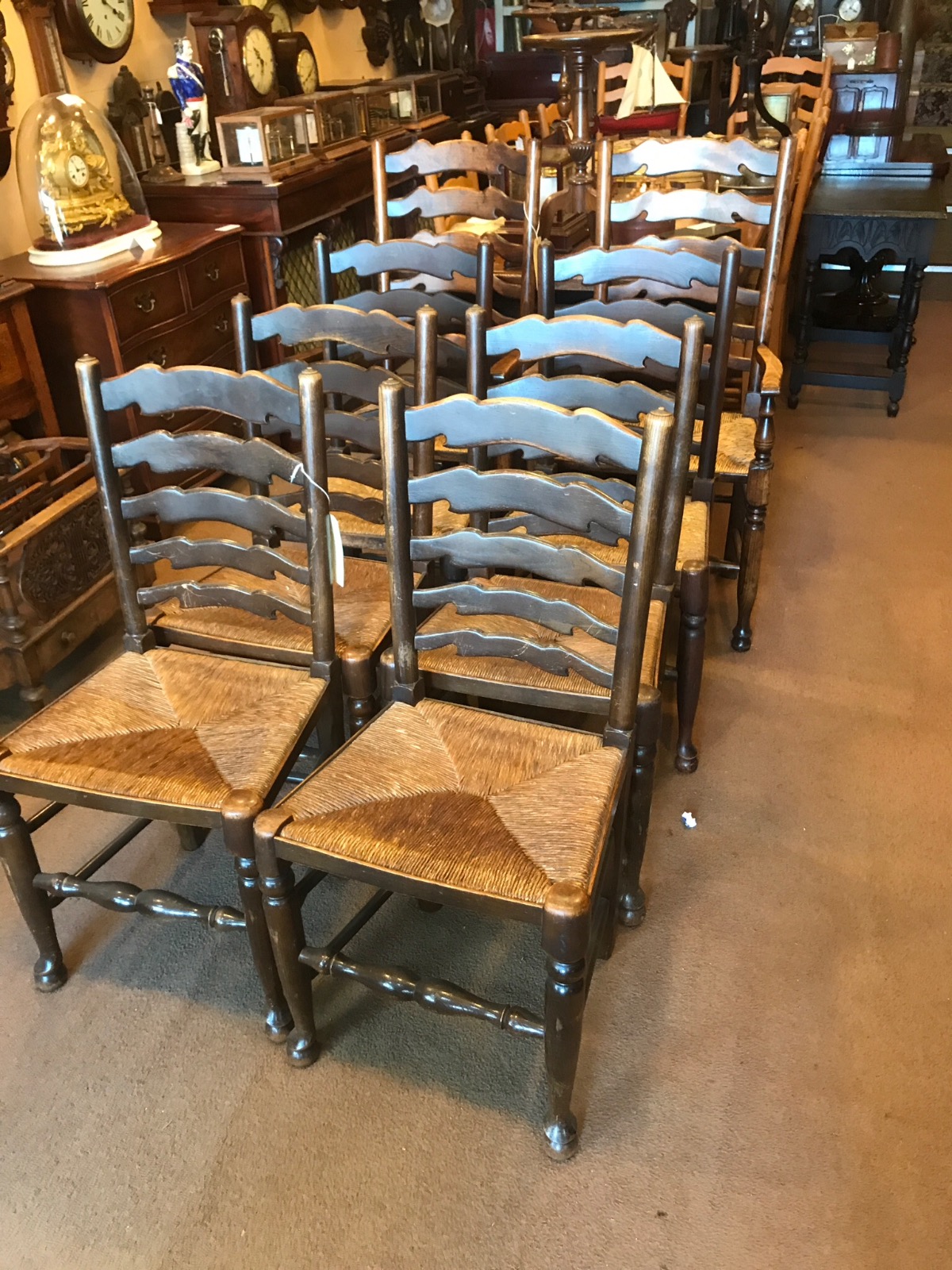 Offered for sale are these harlequin set of eight 20th Century ladderbacks £495 or a pair of carvers by themselves £250 and 6 x diners for £350