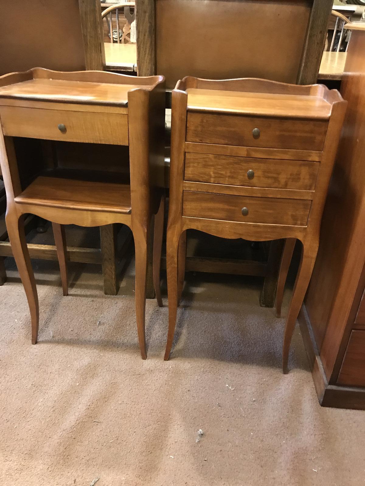 Here we offer a pair of french walnut bedside cabinets with three draws in one and one in the other with an open shelf.