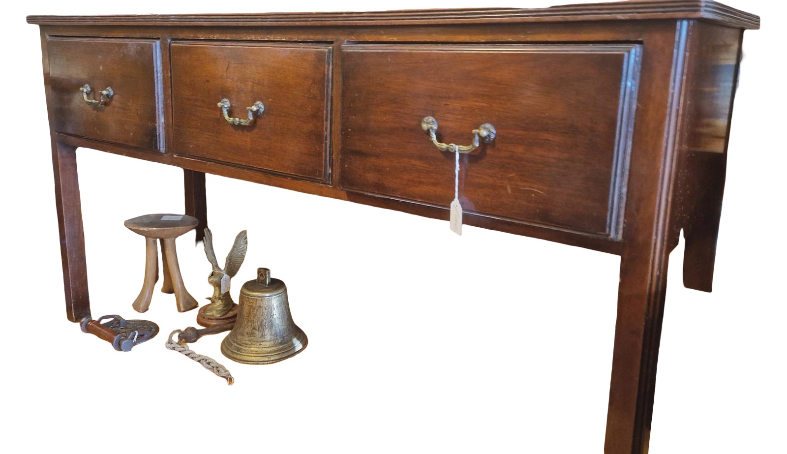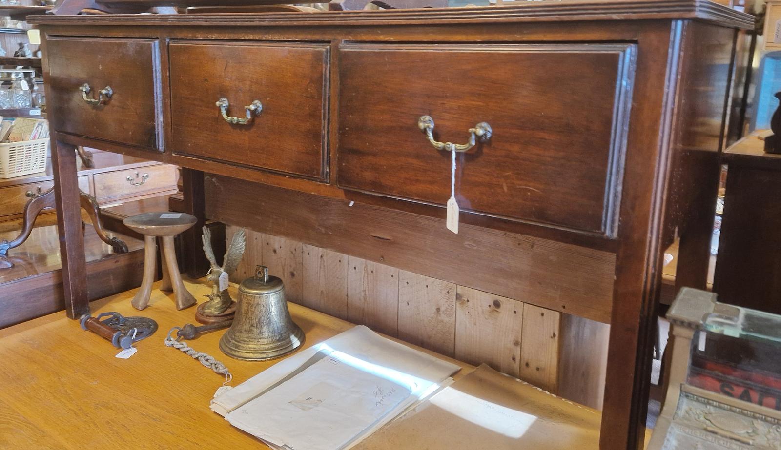 This antique Georgian style dresser base is crafted from dark oak and dates to approximately 1880. The piece features a traditional design characteristic of the Georgian period, with three drawers for storage. This piece of furniture is in good used condition with age related patina and wear.