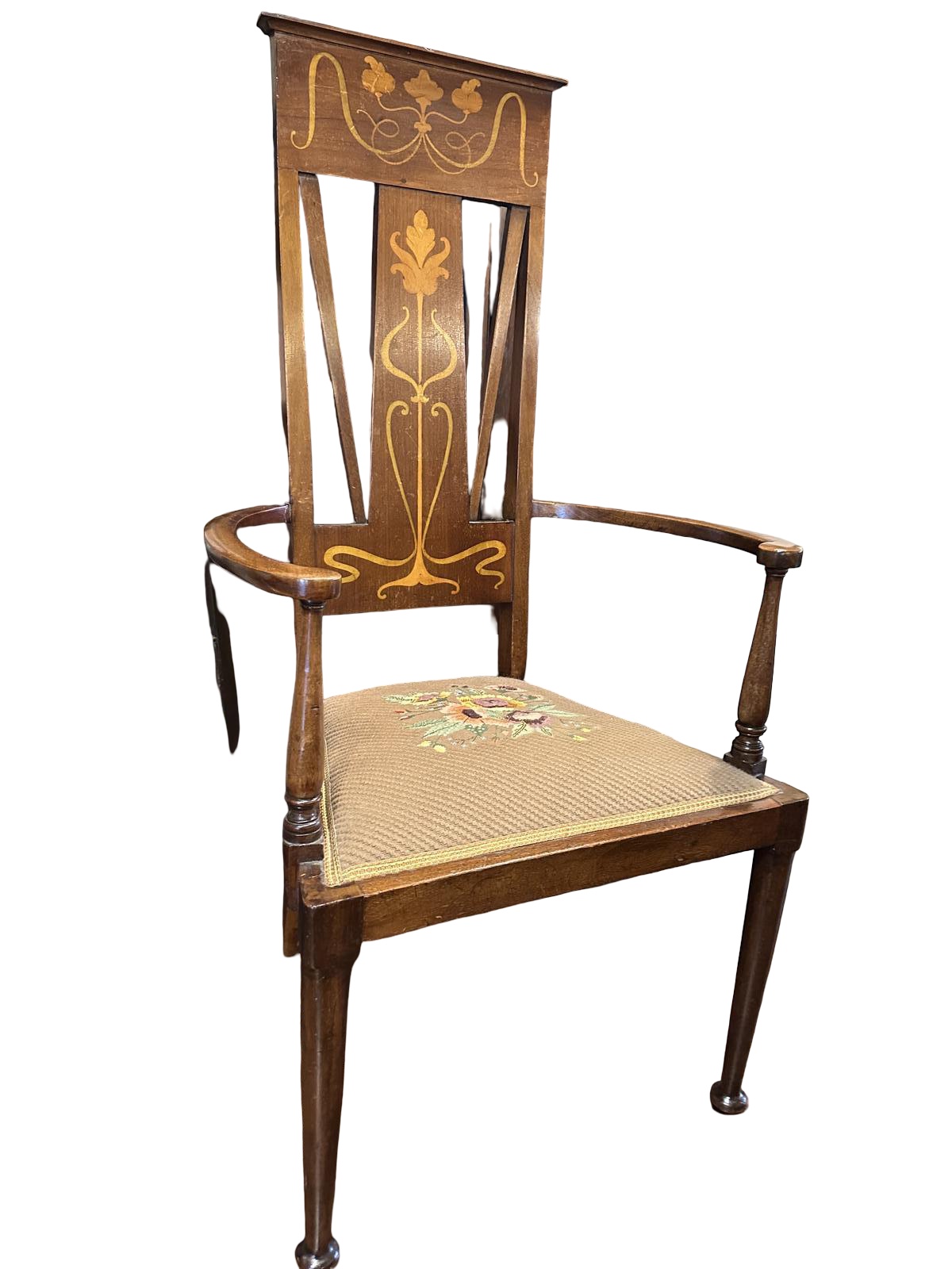 Art Nouveau antique satinwood inlaid mahogany armchair with a lovely needlework hand embroidered wool seat. The chair has all the typical design and shaped Art Nouveau inlays you would expect from a quality chair.