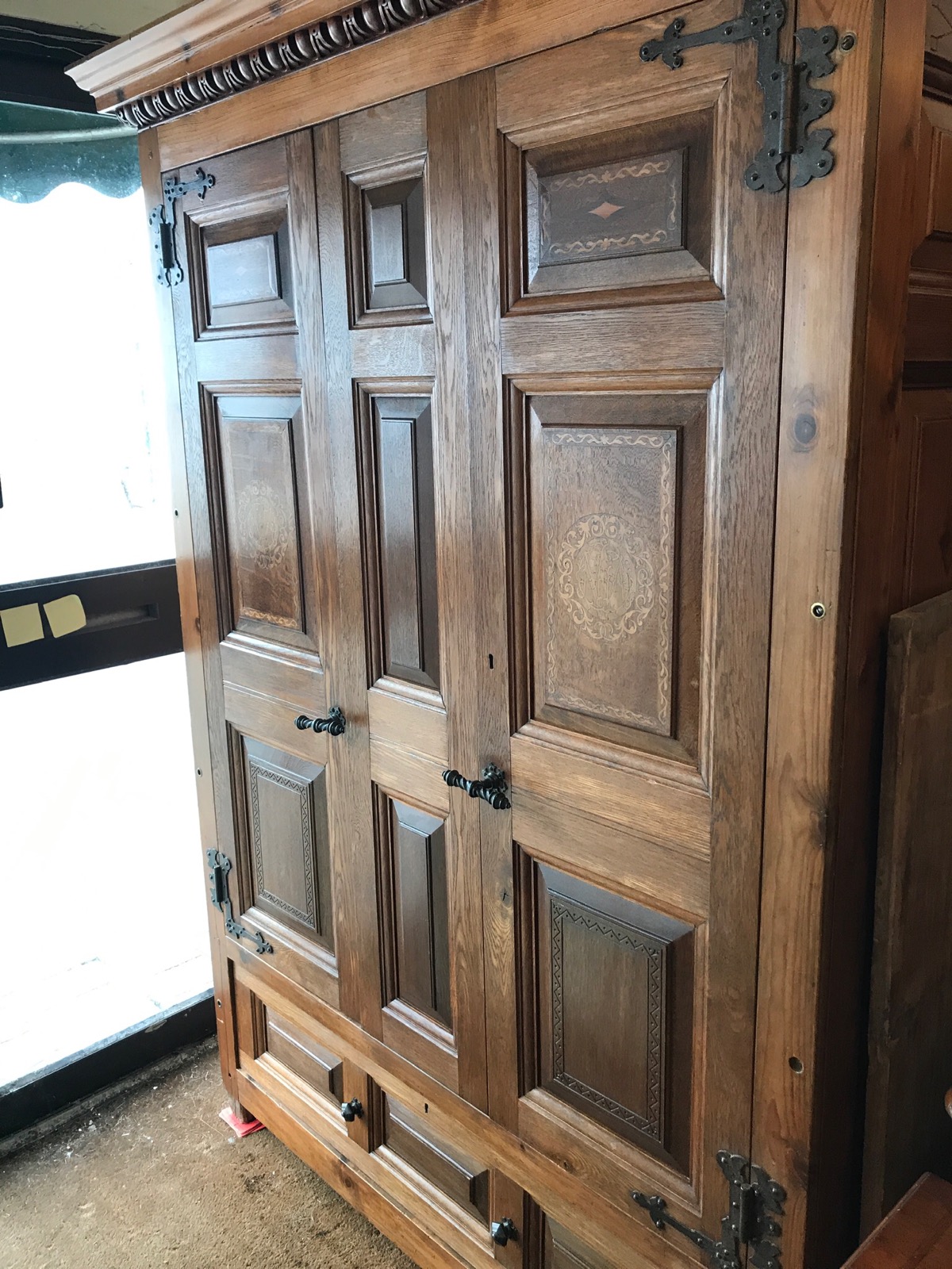 This is a good quality and unusual 19th Century antique pitch pine inlaid 2 door cupboard with nice hand made metal hinges and bronze / brass fittings. Rebated fielded panels on the sides and front. Fantastic quality.