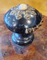 This cigar box has been made in the shape of a Napoleon III merry-go-round. It has been made using beautifully grained Thuya burl and black ebony wood. The base and cap have a serpentine shape embellished with ornate pressed metal beading, the knob is also decorated with the beading (some is missing) and has a white glass cabochon on the top. The doors are all fitted with a gilt metal lyre to the exterior. On the top is a knob that you turn to open and close the doors to access the cigars. Once it would have had attached a musical box that would be activated by opening the doors, the music box mechanism would have closed the doors automatically when the music stopped, sadly this has long gone. There are 6 doors each fitted with gilt brass fittings to hold three cigars.