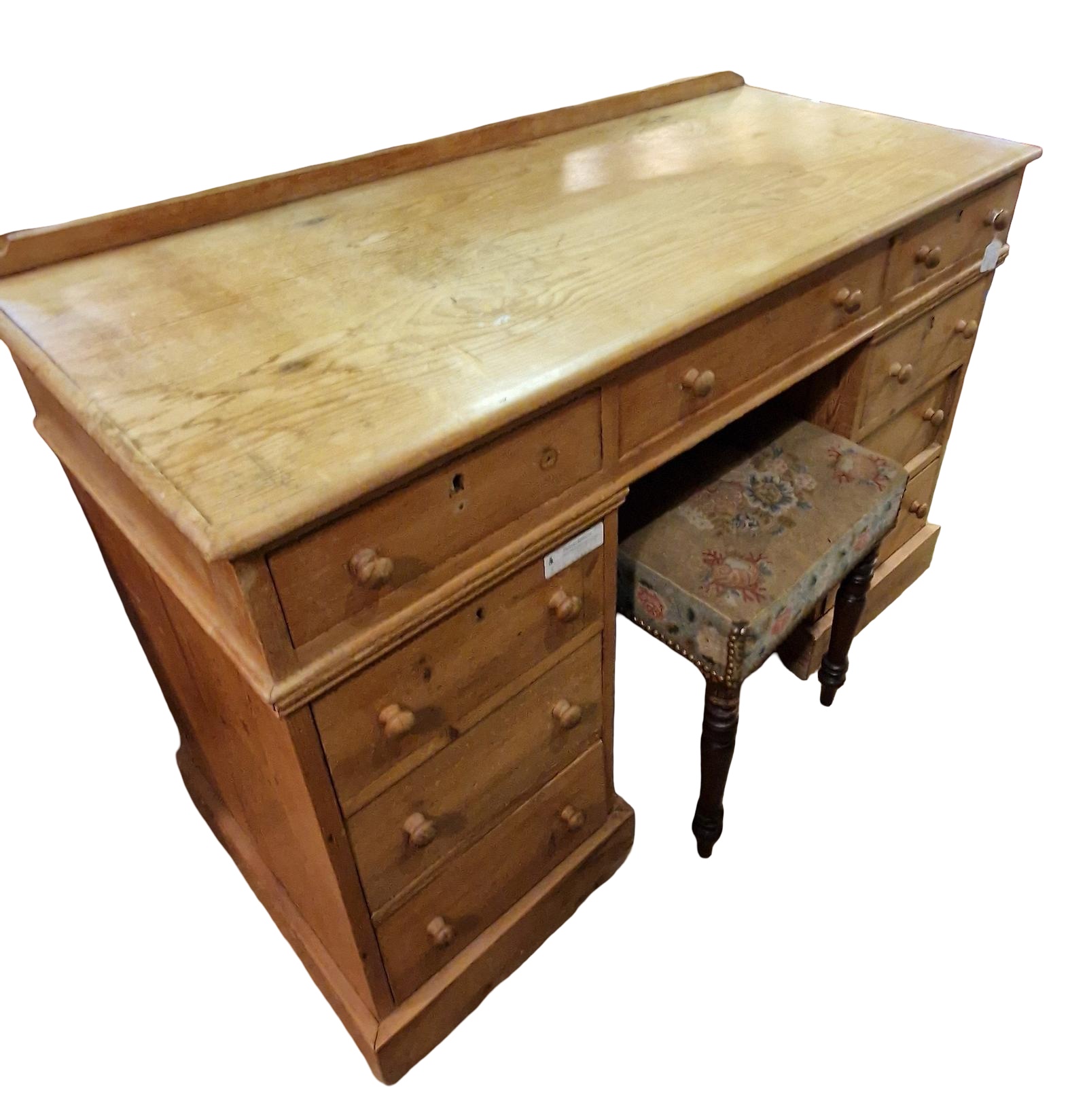 This is an antique pine pedestal desk, created around 1900. The desk features a traditional design with a sturdy structure typical of the period. It is constructed from pine wood and includes two pedestals each with three for storage, the top section has a further three drawers, gining nine in total. The piece shows signs of wear consistent with age. There is an age related shrinkage crack to one pedestal side panel.