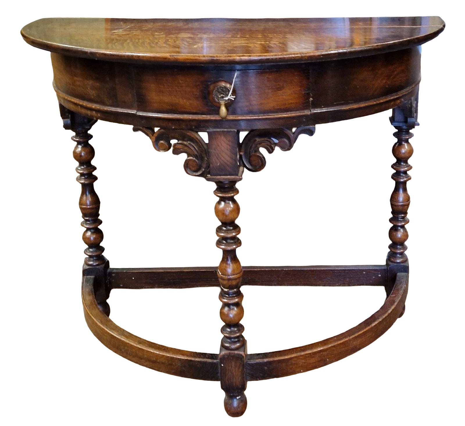 This charming demilune table has been crafted in oak. The semicircular table-top is echoed in the shape of the base. The table is supported by three turned legs, each with open work carved foliate brackets. There is a small drawer set into the apron with a brass drawer pull. There is some age related sun bleaching to the top along with some age related cracks.