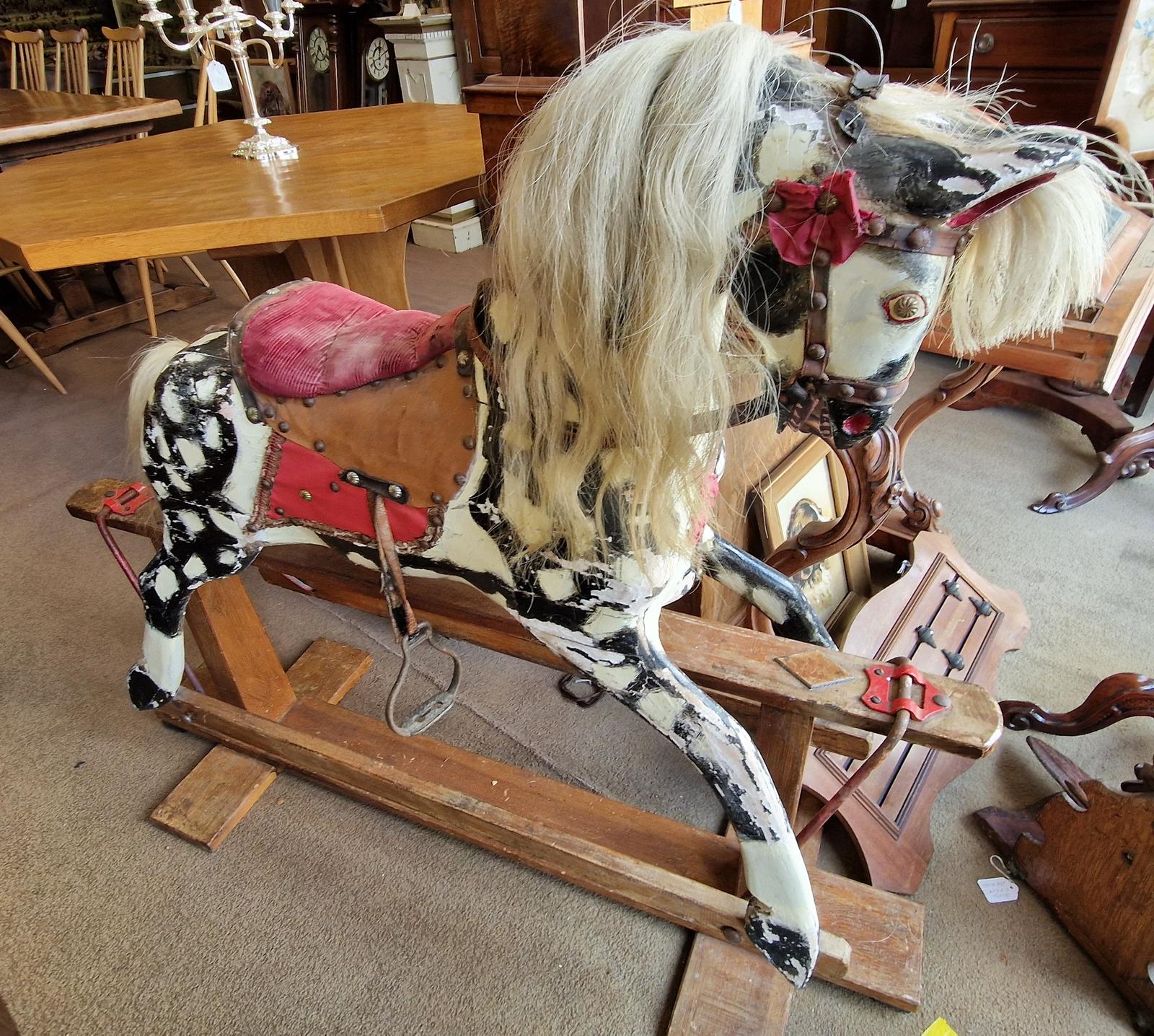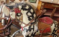 This rocking horse is a real charming character. It has beautifuly carved detail, exuberantly painted features, and stylish leather fittings and corduroy seat. The tail and mane are very realistic. This example of a rocking horse rocks or swings on a fixed cradle, making it very stable. The rocking horse is play worn.
