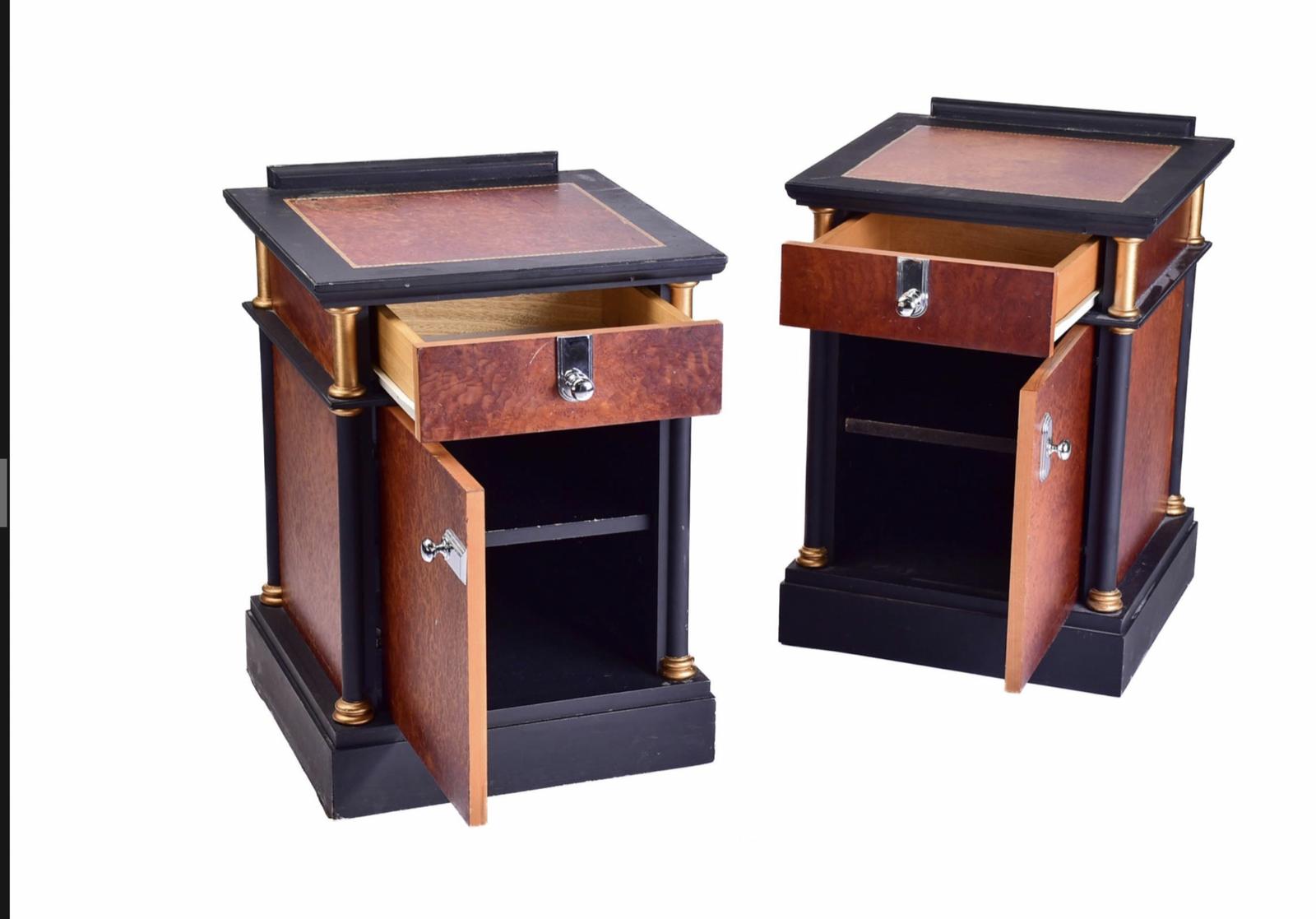 A good contemporary burr walnut pair of bedsides with Ebonized parquet lined inlaid Amboyna gilt pillars. This pair of classic 20 century bedside cabinets are in overall good original order.