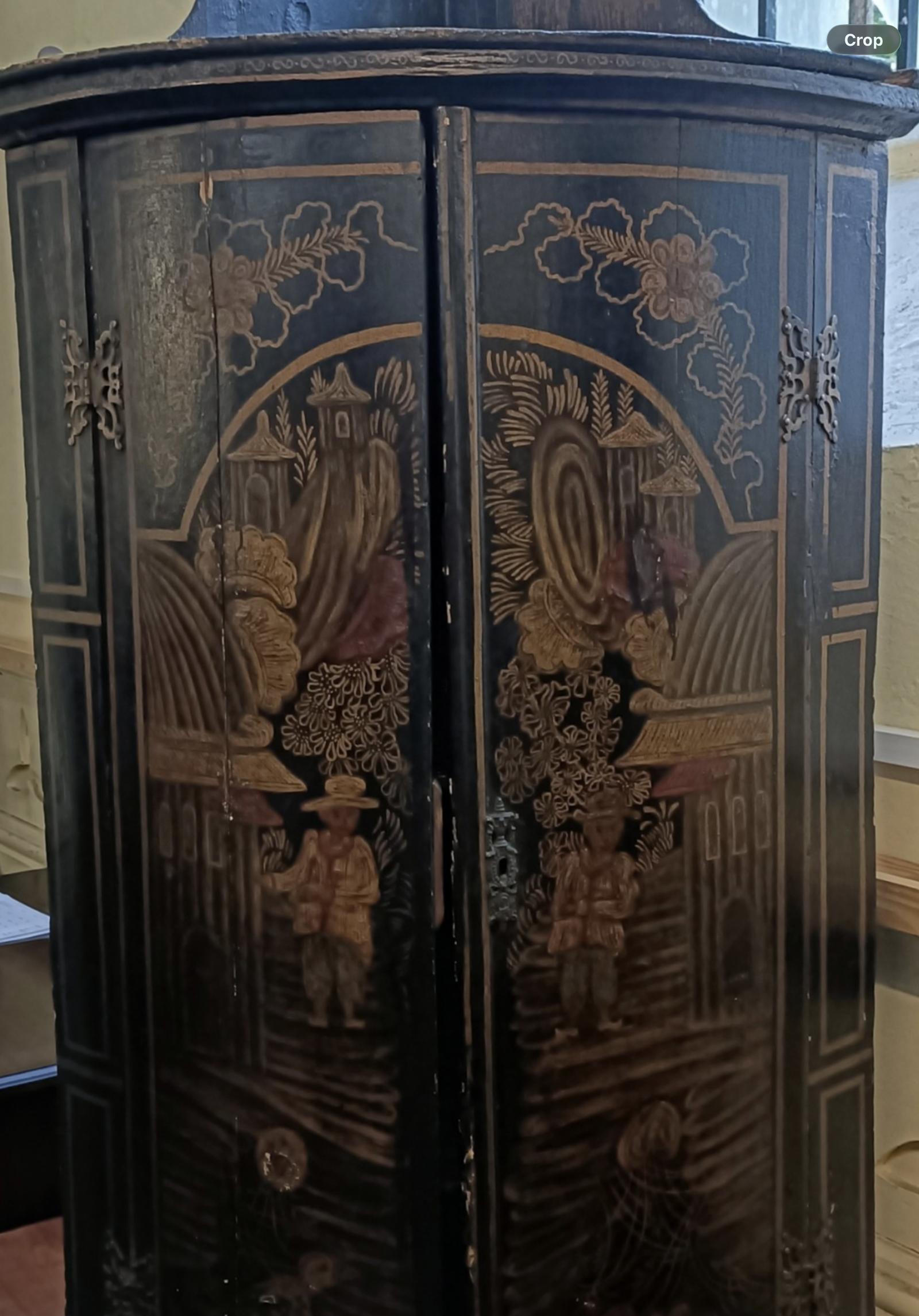 This early 19th century decorated corner cupboard dates to approximately 1780. It features a distinctive design suitable for corner placement, utilising space efficiently. The cupboard is constructed from wood and showcases decorative elements typical of the period. It includes shelves for storage and may exhibit signs of wear consistent with its age.
