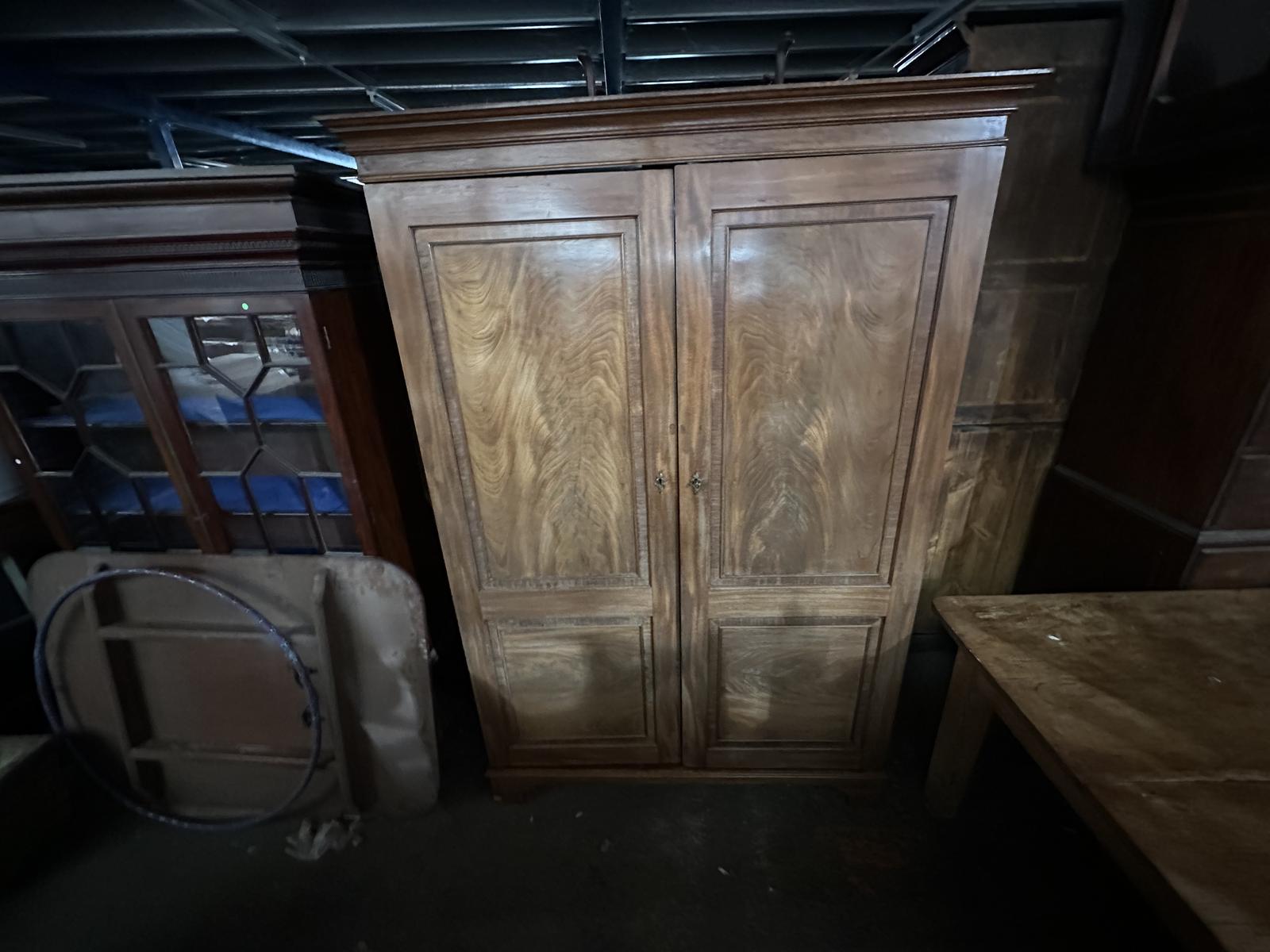 Victorian Early 19th wardrobe with figured mahogany doors. Good hanging space, partly fitted plus drawer in base. Comes apart for access and transport.
