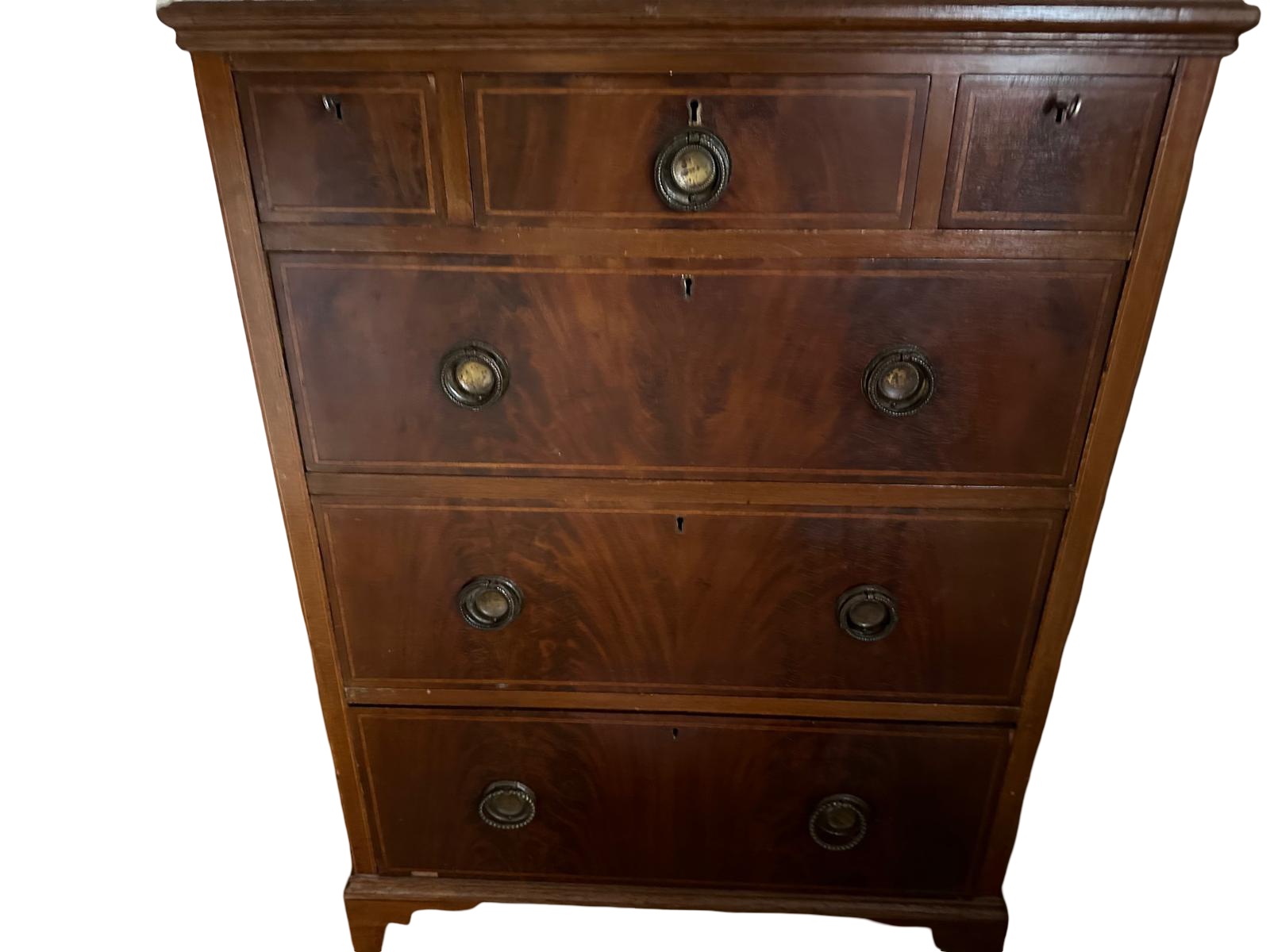 Offered for sale is this Edwardian antique chest of drawers inlaid in mahogany small with an unusual drawer layout having three long drawers and three small along the top row. In good original order all standing on bracket feet.