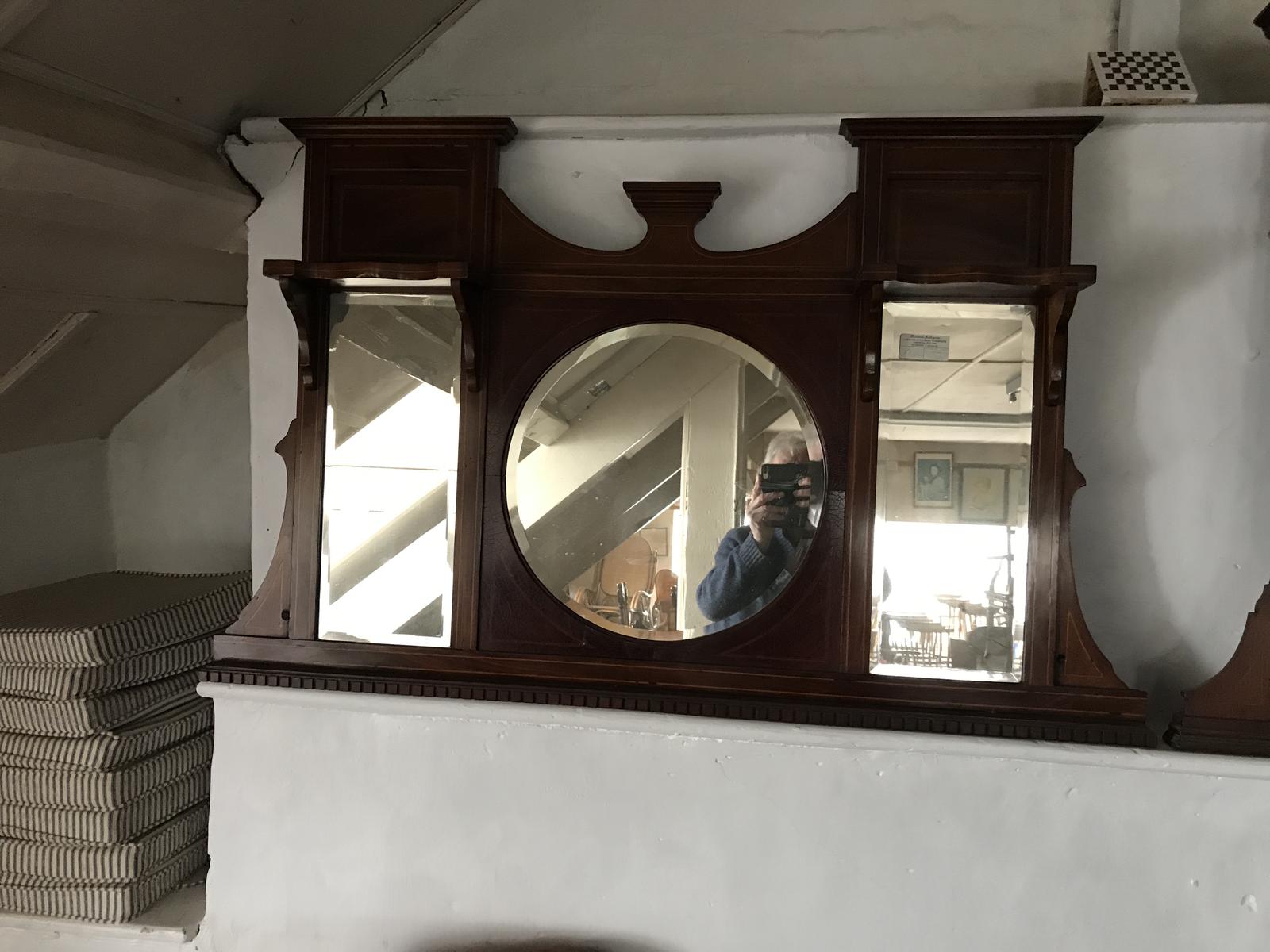 Nice quality Edwardian mahogany inlaid overmantle mirror with a three plate mirror centre one circular ,all three bevelled with inlay to the sides and corners. There is inlay all over including the ears and pediment.