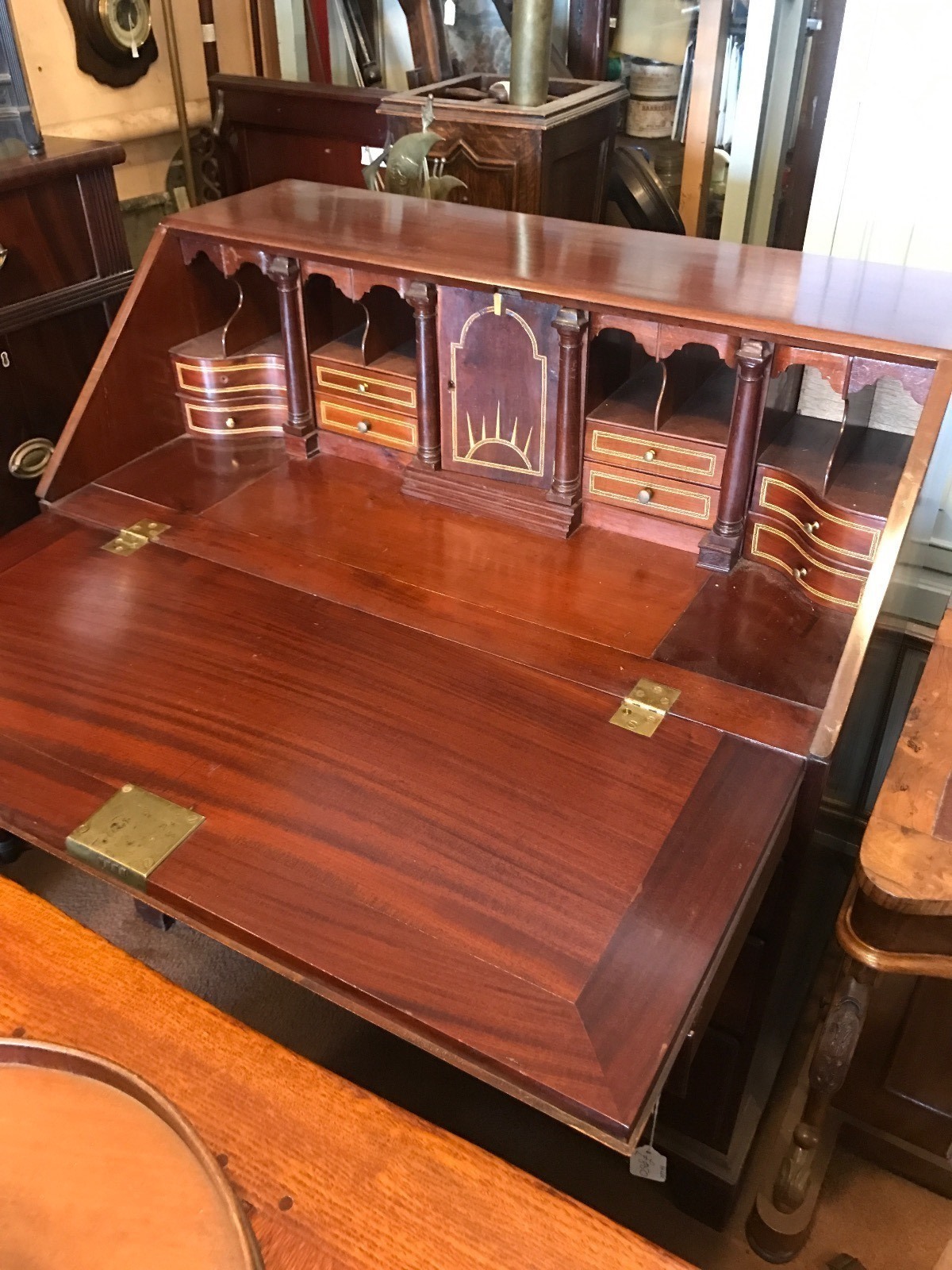 This is a good mahogany George III antique bureau with spectacular fitted interior and lots of secret compartments Good condition wth replacement swan neck brass handles