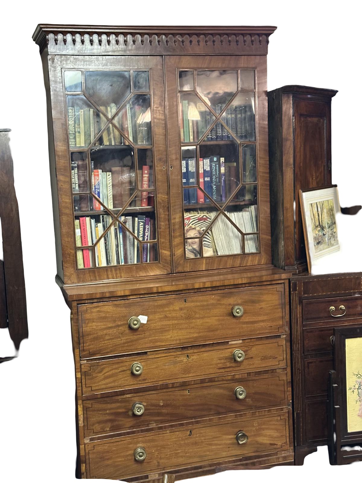 Quality Georgian secretaire bookcase in mahogany with fine inlaid glazing bars bracket feet and tear drop cornice all in original unrestored condition. A useful and practical piece of furniture.