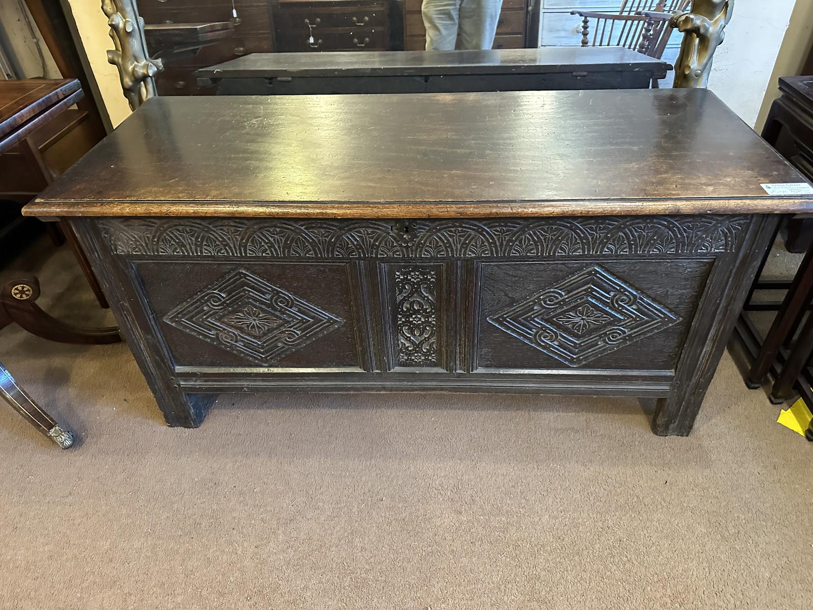 Good 18th century oak coffer/trunk with diamond carved twin panel front and well carved freeze and up rights original lock and hand made strap hinges and solid top.