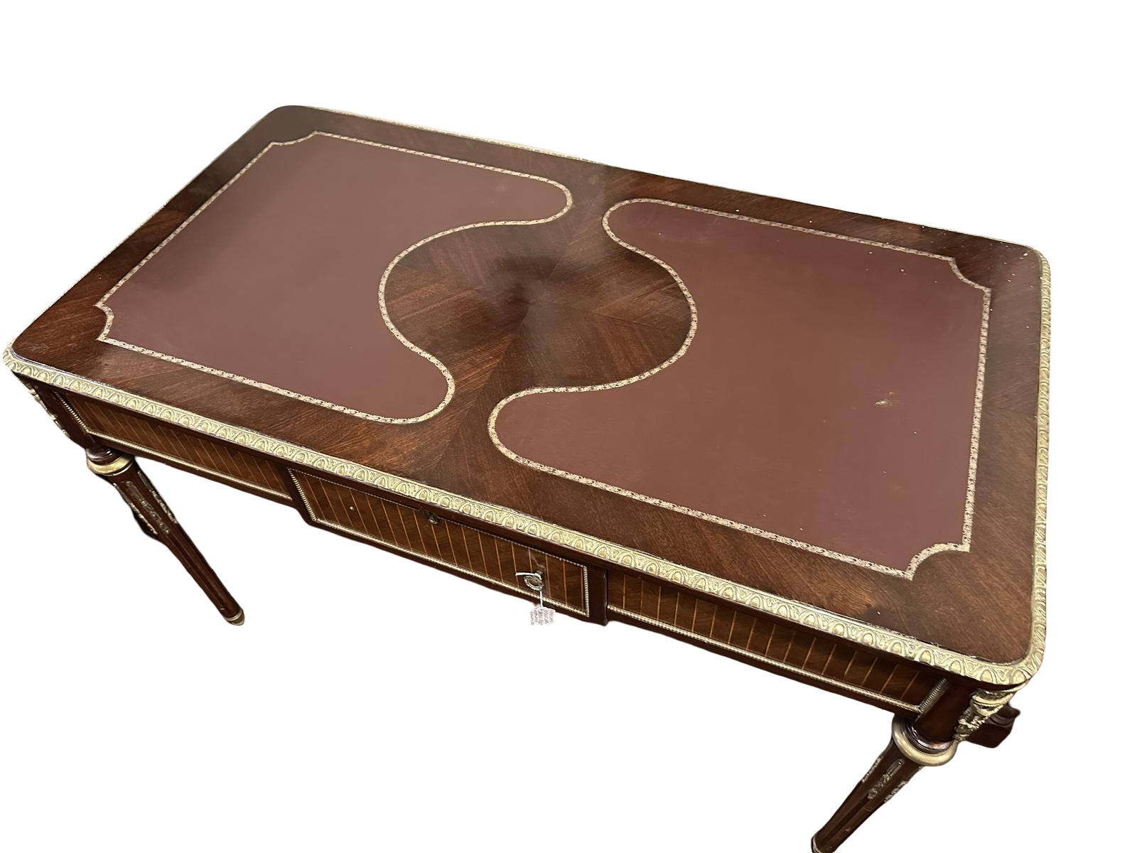 Good quality writing desk Or writing table /bureau platt amazing quality with multi different type of wood veneers gilt brass mounts to top of each leg and all around the top edge. Good shaped leather writing area. Altogether a very impressive piece.