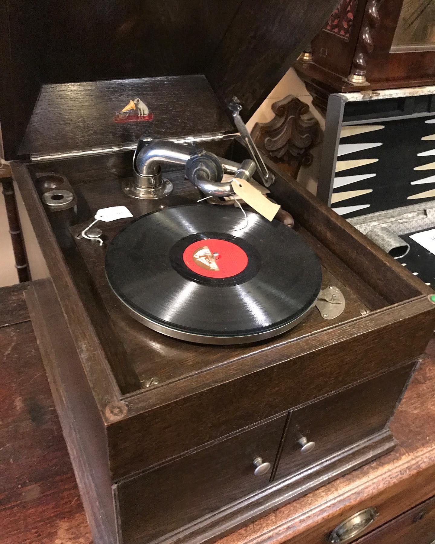 Hmv table top wind-up gramaphone, with original music head /box sold in good working order, doors open to adjust volume.