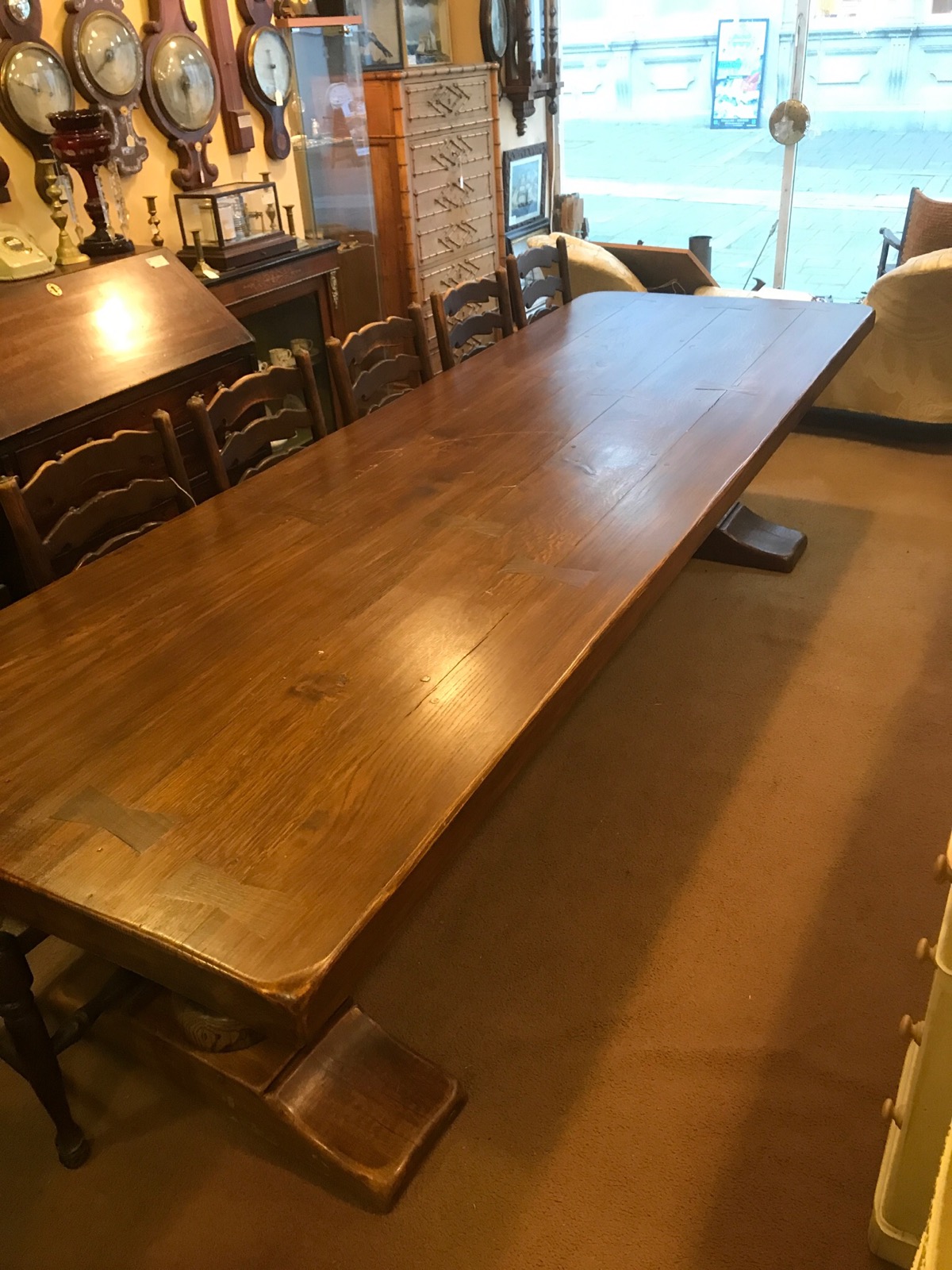 Offered for sale is this large early 20th Century chunky solid oak refectory table with 7cm thick top and 3 metres long.