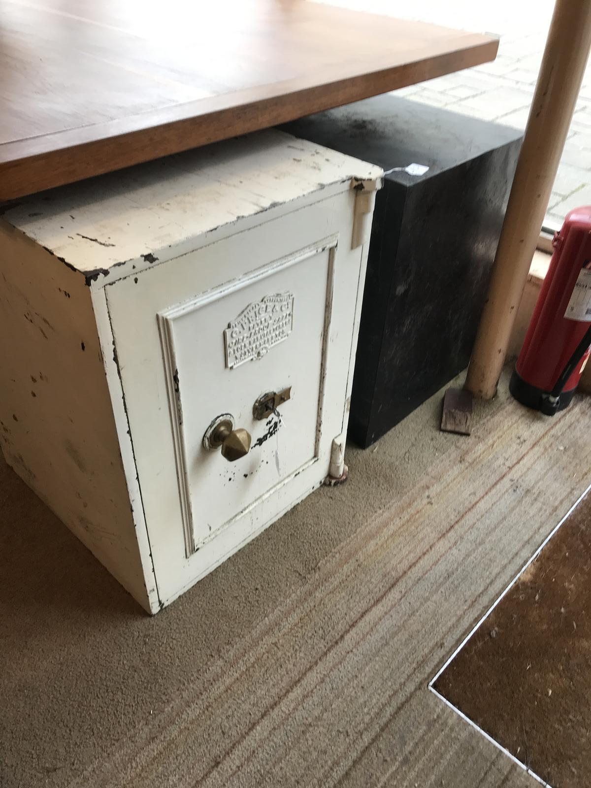 Large iron safe with key And internal cash draw painted white in good order with no rust. Brass handle and makers plaque good size and value.