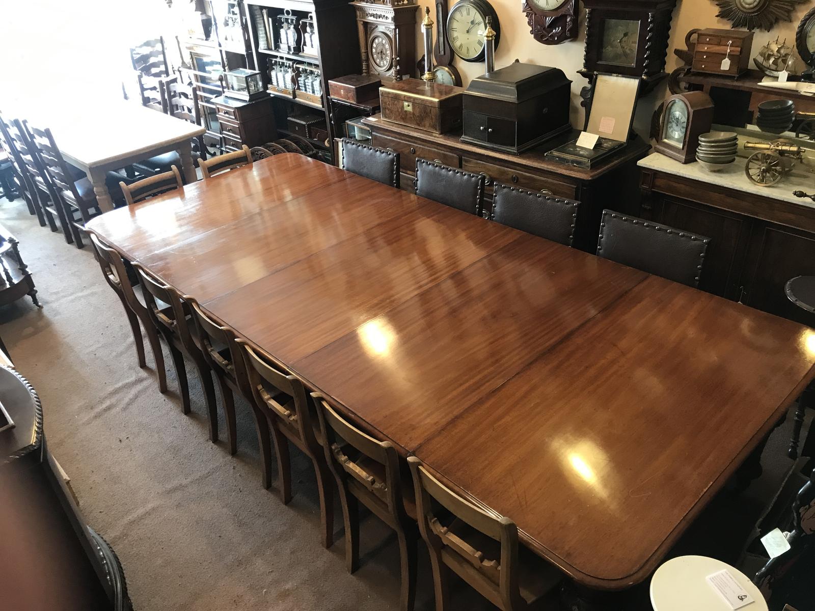 This is a large early Victorian antique mahogany three leaf extending dining table with good original patina and colour. This table was purchased locally from a local private house who had owned it for a long time. The table has a lovely carved and fluted leg and a pull out mechanism so you can use it with one two or three leaves inserted or none.