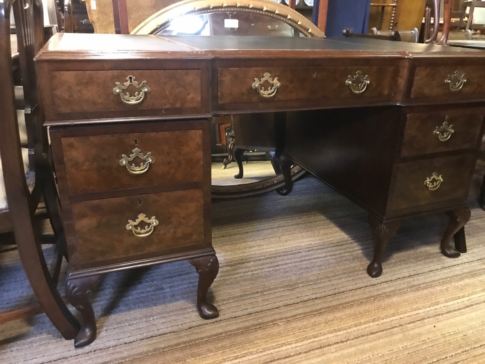 Good clean restored large breakfront walnut writing desk in three parts on Cabriole legs and solid brass handles