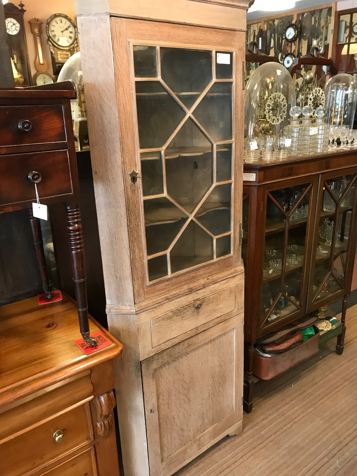 This is an original and unrestored limed oak 19 century part glazed corner cupboard with shaped shelves. Bargain at only 150.