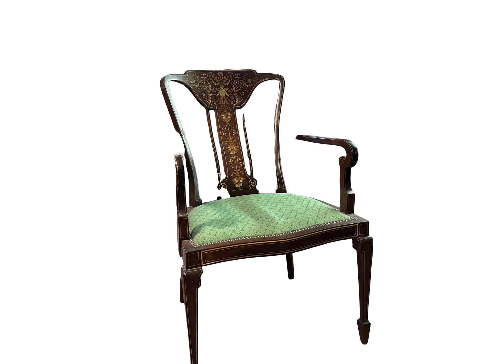 Lovely inlaid Edwardian armchair in mahogany with satinwood and bone inlay. The back has a very ornate inlay wit intricate design as well as the legs and th seat is very good order as can be seen from our photos.