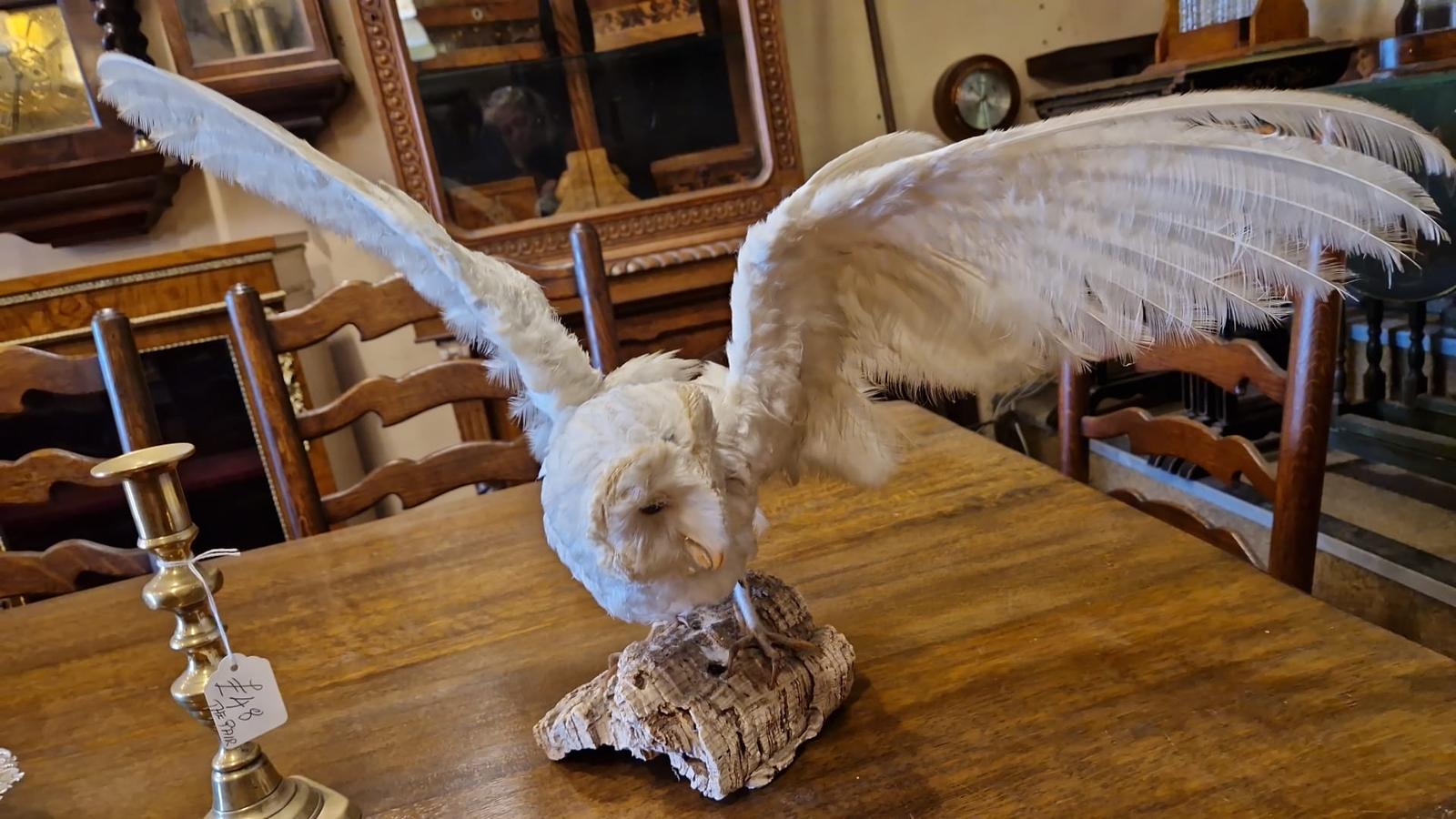 Lovely mounted taxidermy owl In open flying position and mounted on a carved natural section of wood. This unusual mounded snowy owl is in overall very good condition.