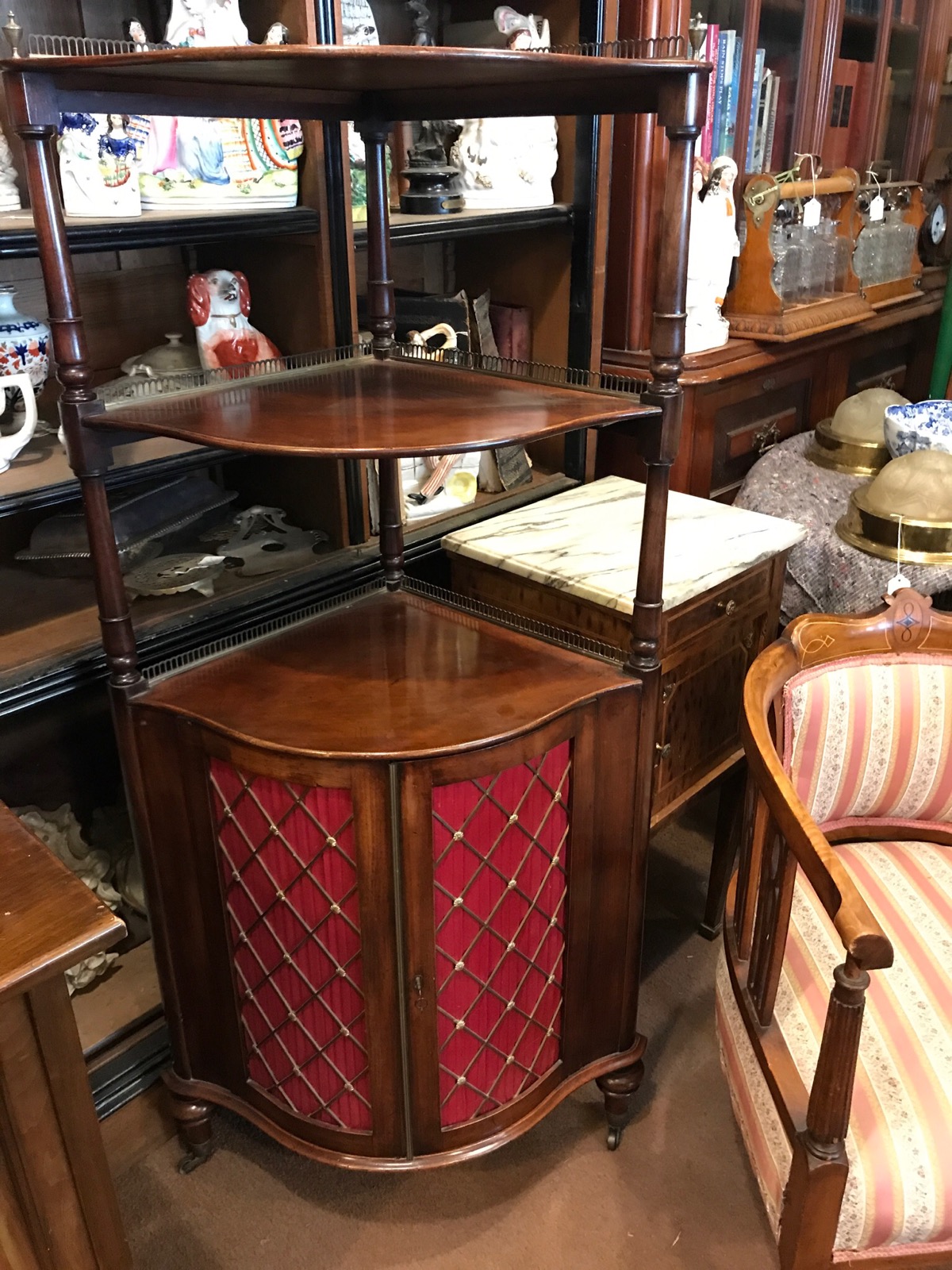 Good quality 19th Century antique mahogany bow corner wot not over a bow front 2 door base with decorative brass diamond shaped grill and brass gallery to each shelf.