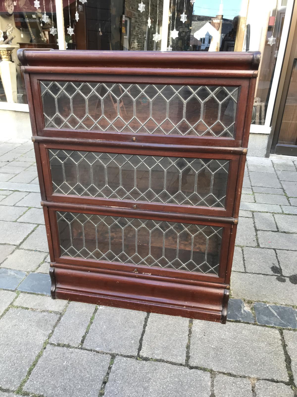 A clean three section original globe wernicke bookcase is offered for sale with leaded glazed doors and in mahogany with polished top. Item will break down into five sections for delivery.
