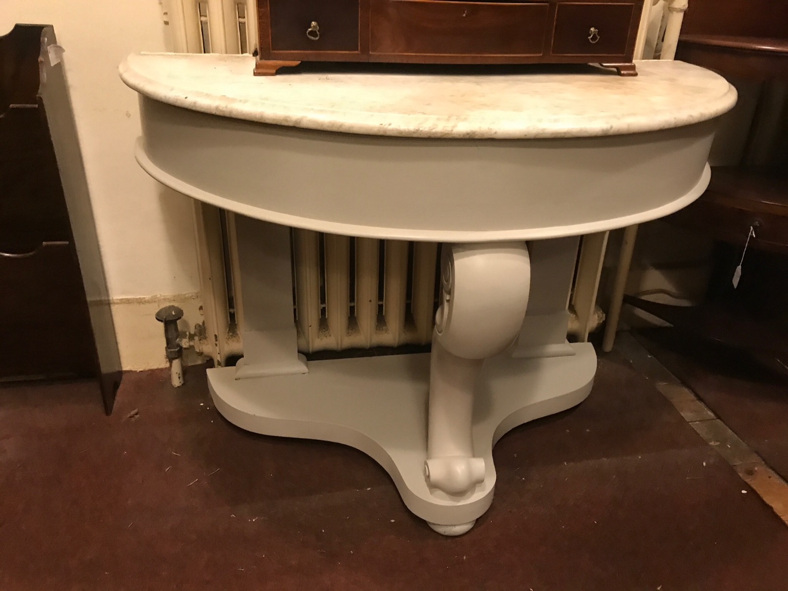 Offered for sale is this 19th Century antique white marble to Demi lune washstand with painted base.