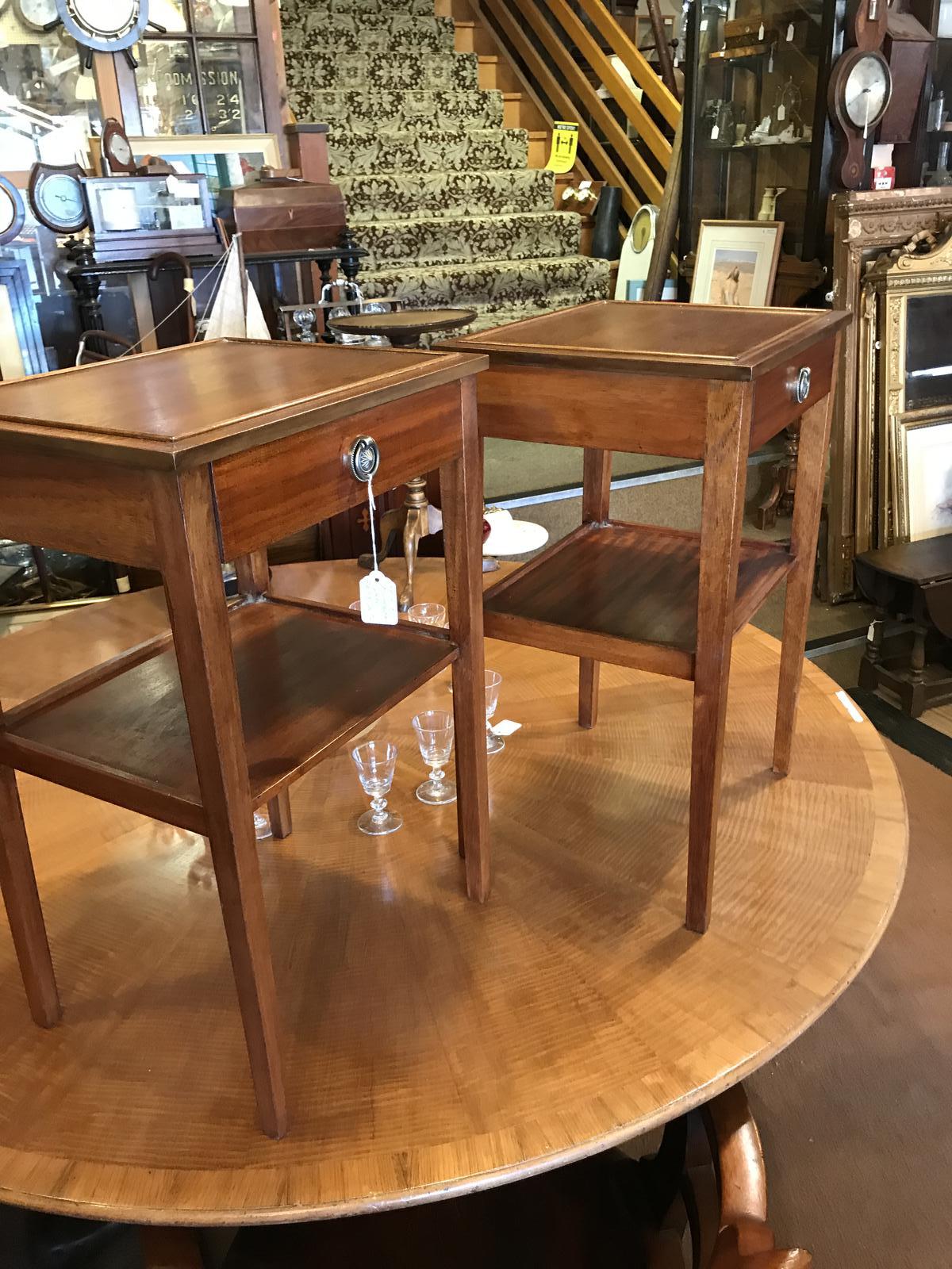 Good pair of mahogany bedside cabinets with one draw a lower shelf and square tapering legs, the top has a small bed around it to stop items falling off.