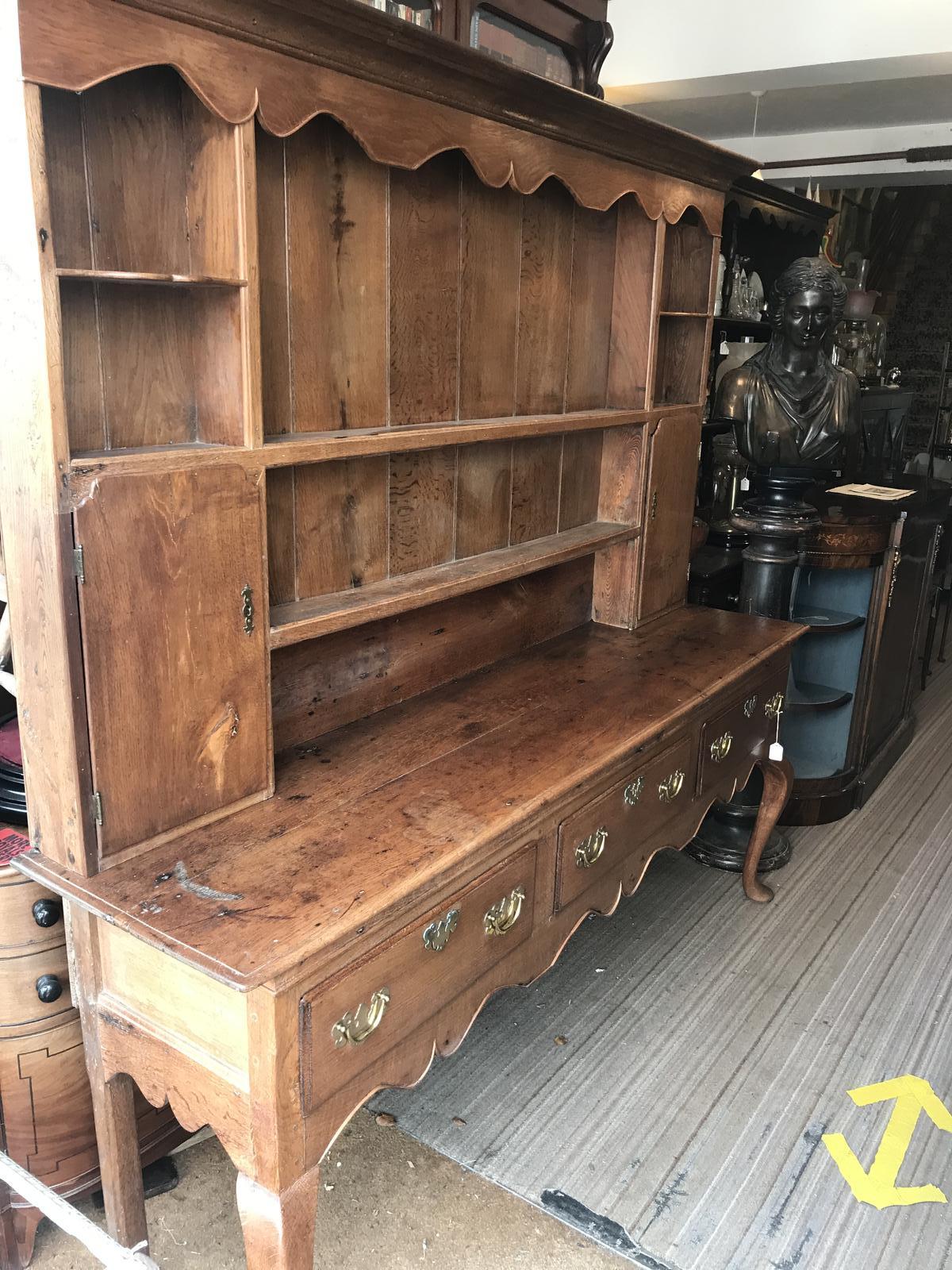 A Victorian pale oak early 19th century dresser with open rack top fitted with 2 doors over a 3 drawer base sitting on shaped cabriole legs.