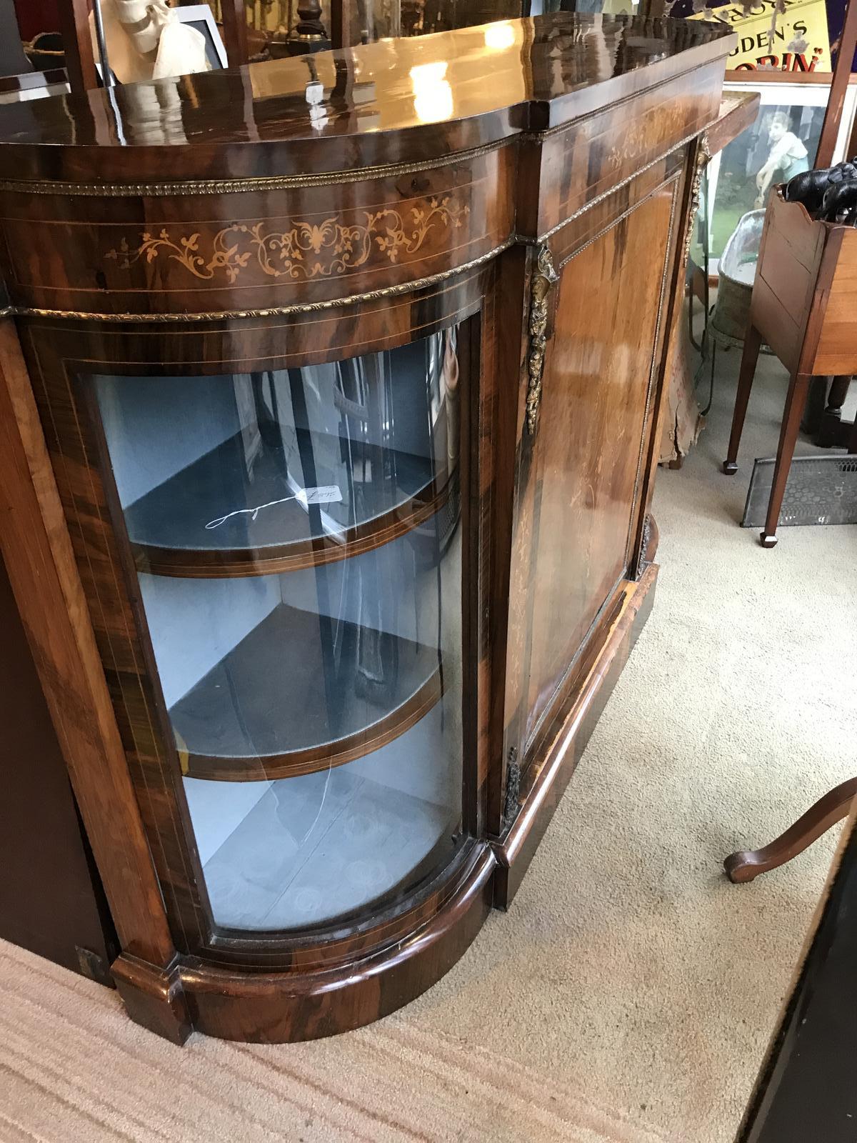 A quality walnut inlaid credenza For sale with bow glazed sides and marquetry inlay along top freeze and centre panel door. This credenza is in lovely original condition having good gilt brass mounts.