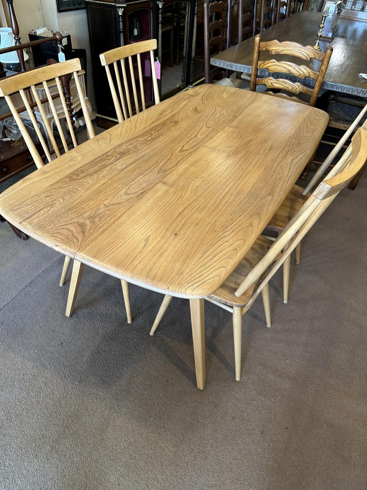 Original c1970 elm table and Windsor 608 kitchen chairs in light blond finish all in excellent condition. These particular chairs a a very unusual model with the stick back going below the seat and not into it.