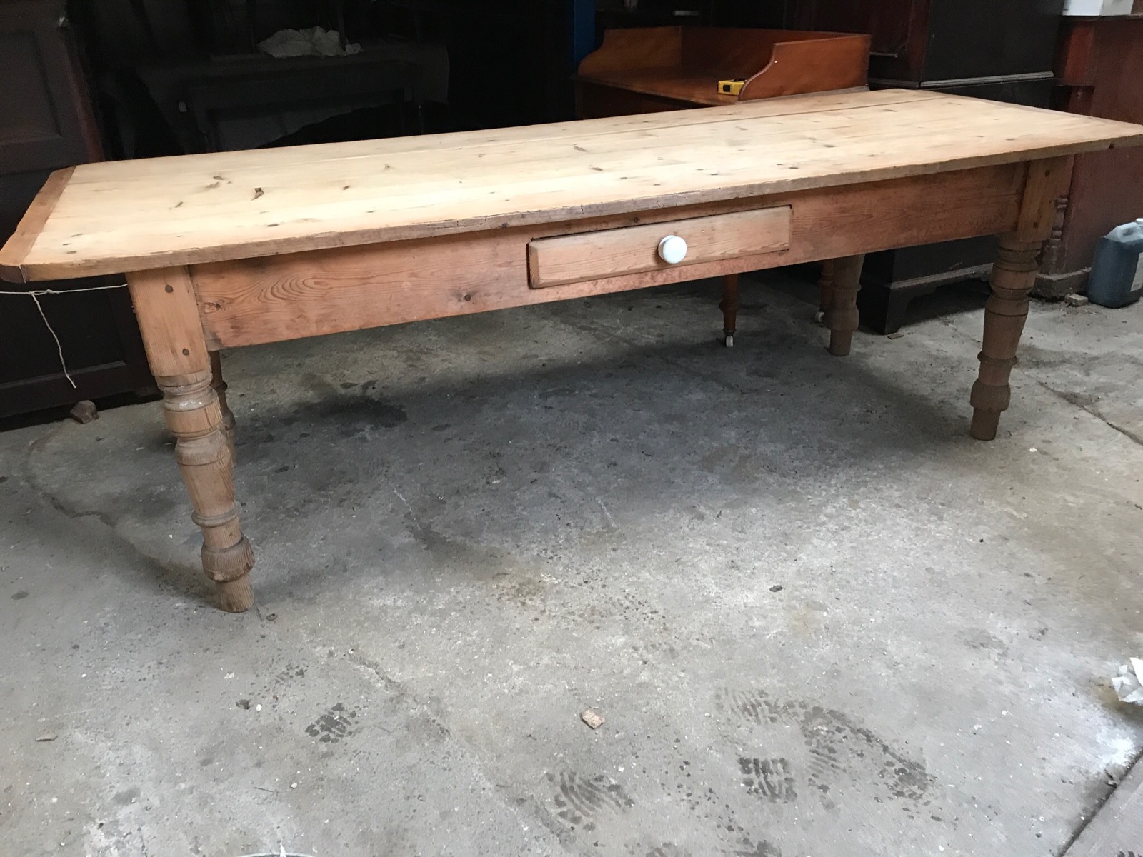 Nice original Cornish farmhouse pine kitchen table with reversible flip over top having turned legs and one draw
