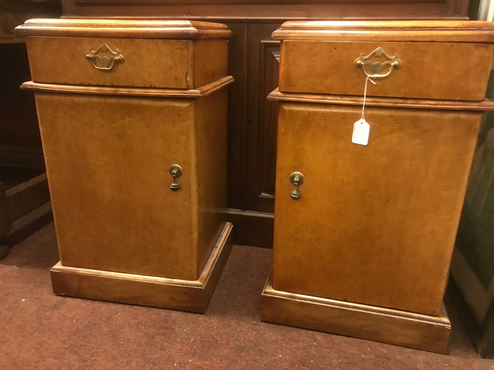 This is a nice pair of Art Deco birdseye maple bedside / pot cupboard with one drawer above cupboard door with shelf both having solid brass fittings.