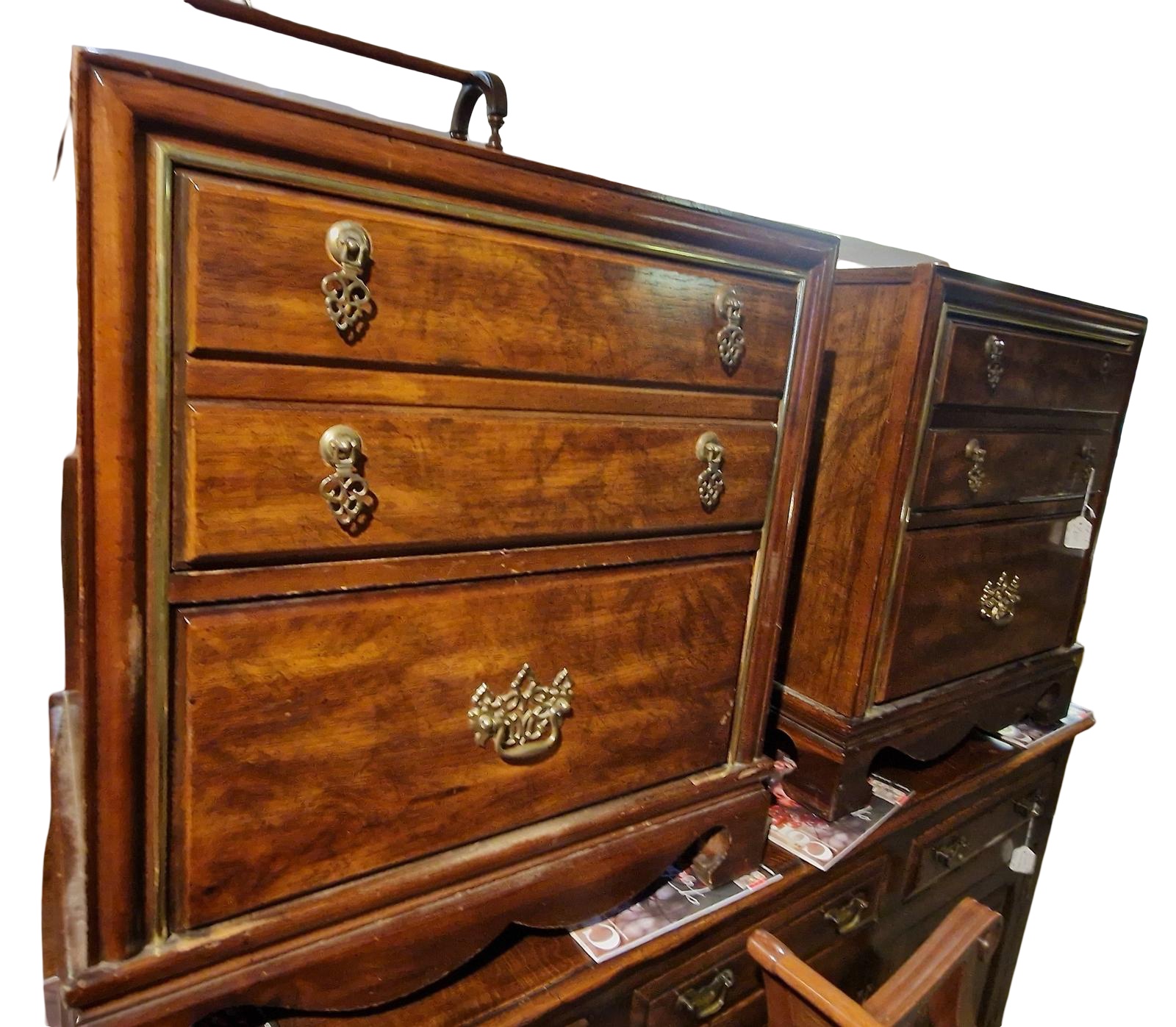 This is a pair of vintage bedside drawers, created circa 1970. The drawers are constructed from mahogany and have a stylish design. Each cabinet has two drawers of equal size, the upper drrawer has detailing to the front, that at a glance, the drawer appears to be two smaller ones. They are bedside tables, due to their generous proprtions they would also work as side tables in a lounge setting. Their are some scuffs from age and use, one drawer handle is missing.