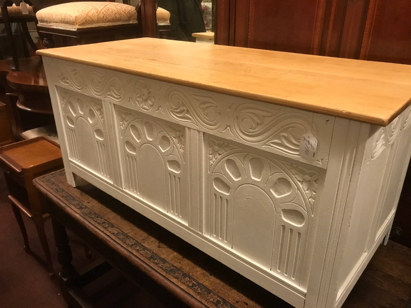 Offered for sale is this 20th century carved oak three panel coffer / trunk with painted base and stripped light oak top.