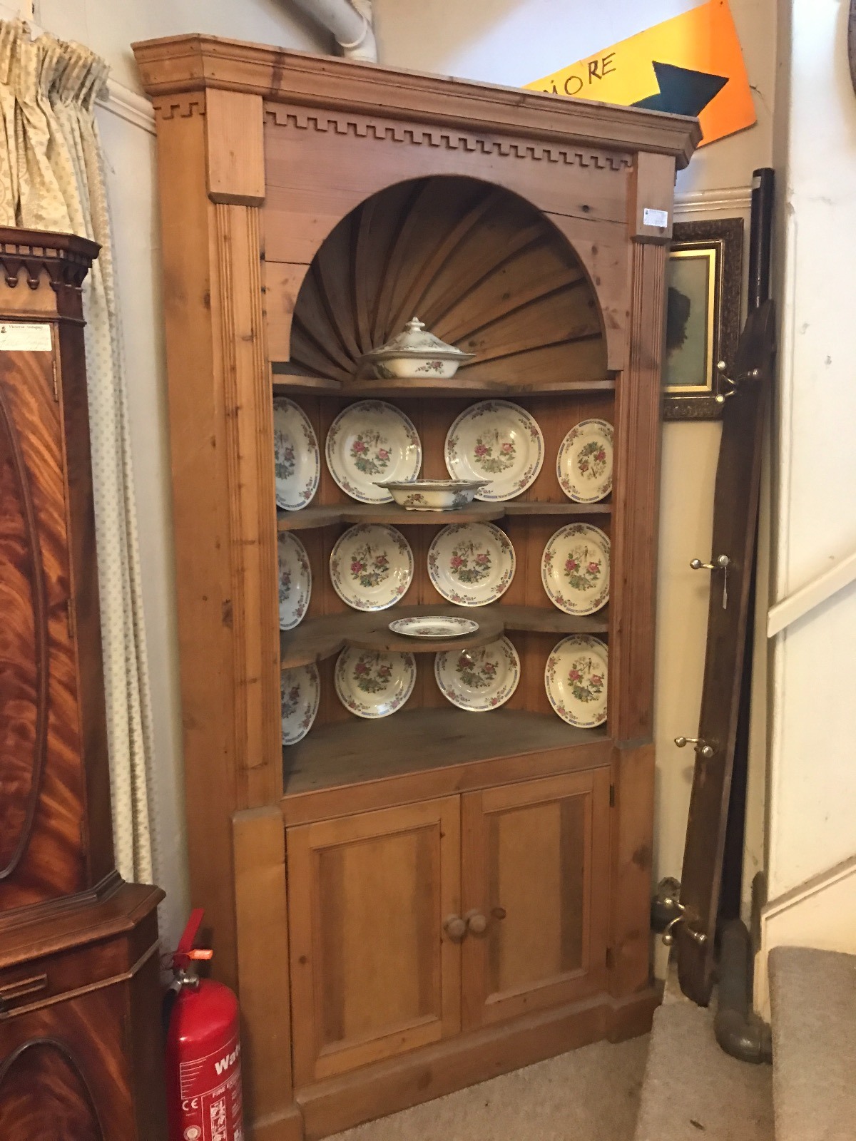 This is a 20th century pine barrel back corner cupboard having a open top section with shaped shelves and two storage cupboards below.