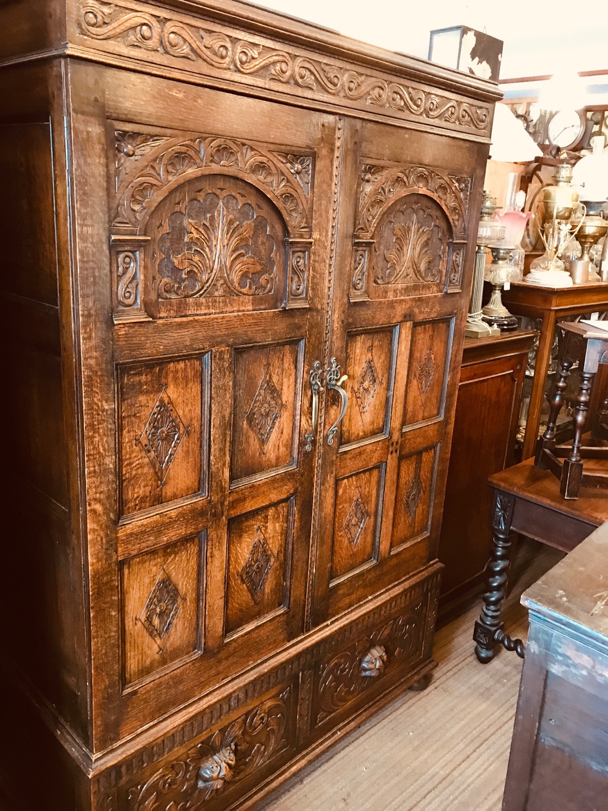 This is a top quality 19th Century antique solid two door fitted carved oak wardrobe with drawer below.