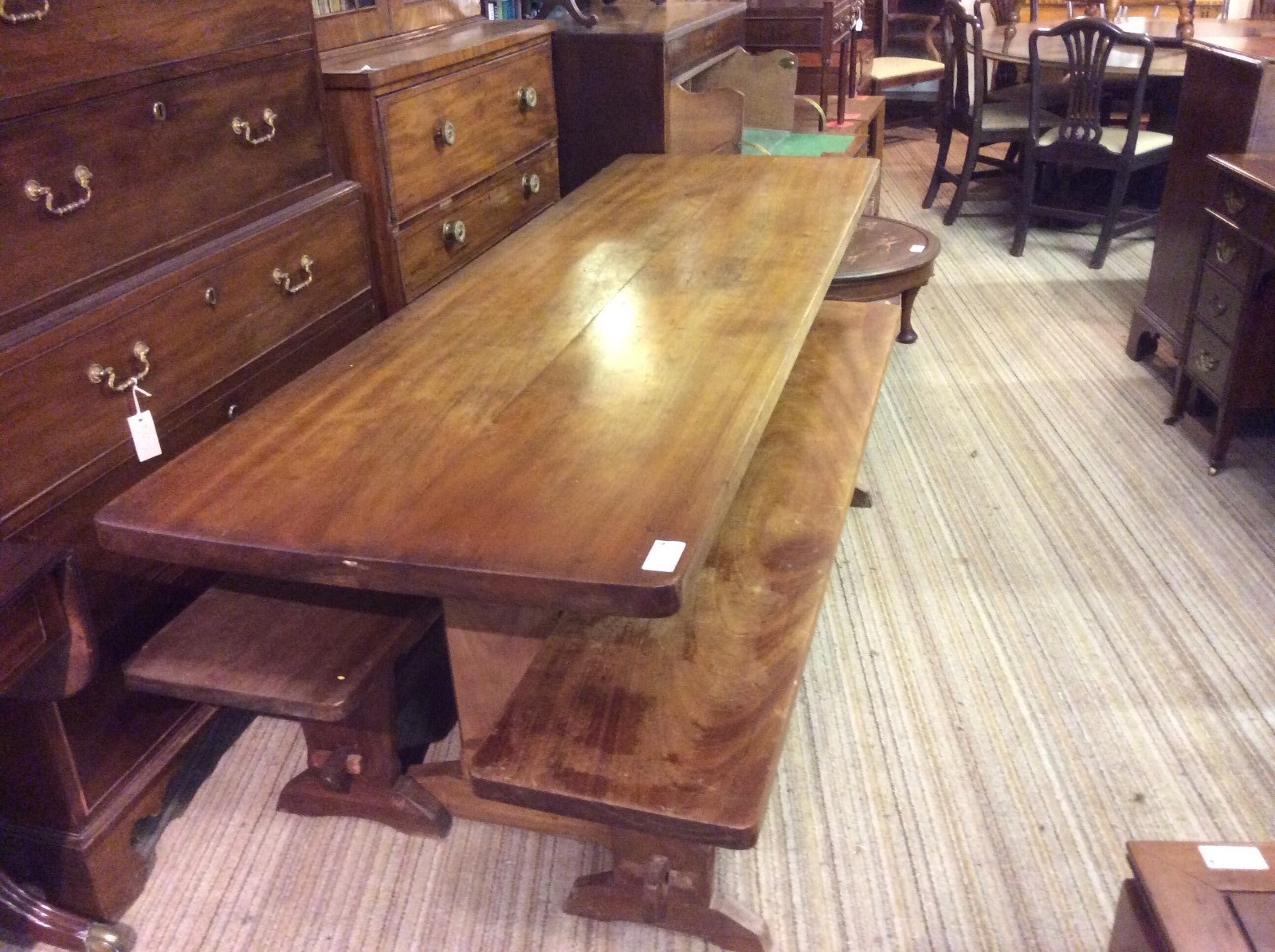 This is a good solid birch refectory table with two plank thick top standing on a centre stretcher base. Very good value as it also comes complete with a pair of matching benches.