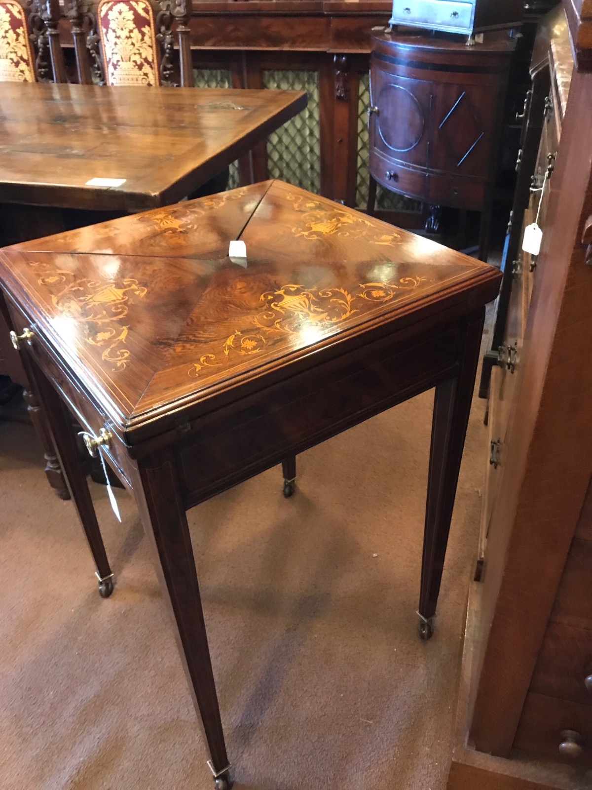 This is a lovely antique rosewood marquetry inlaid envelope card table with one draw and inlaid square tapered legs terminating with casters.this item has been fully restored and is therefore in tip top condition.