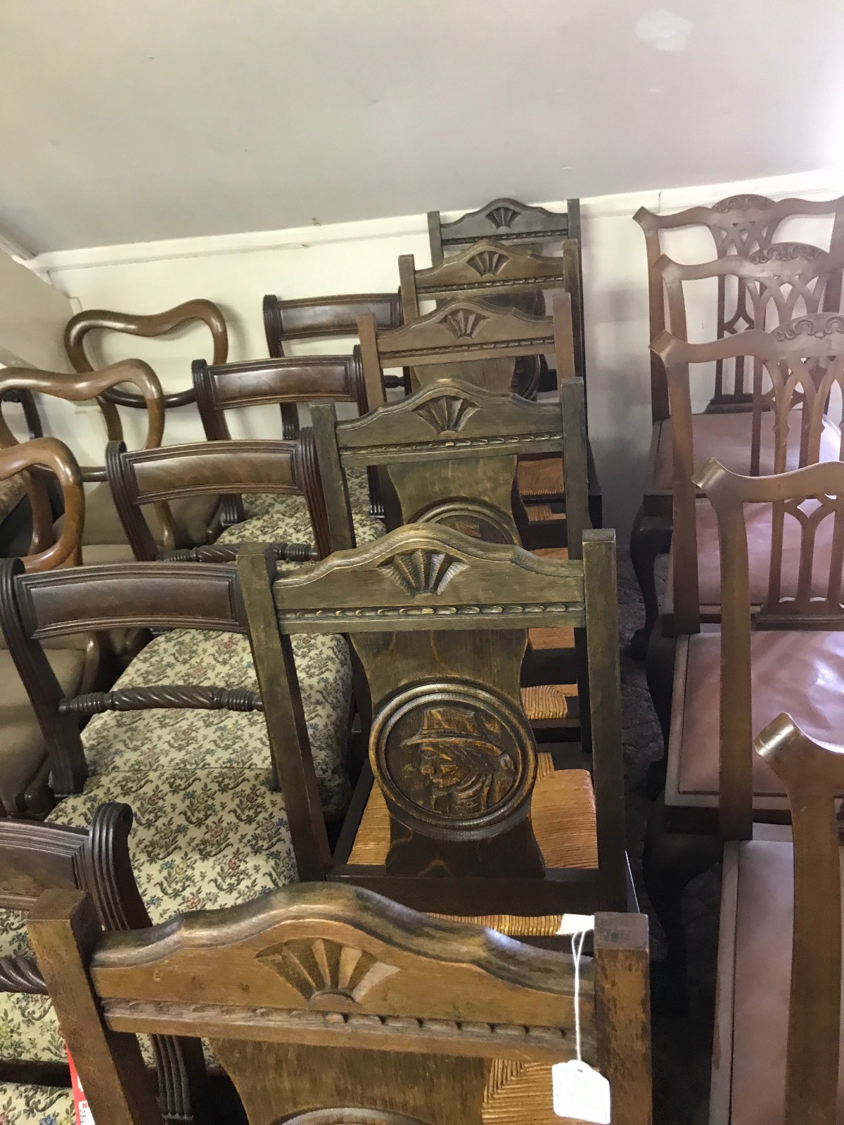 These are good and unusual carved oak set of six chairs with drop in rush seats