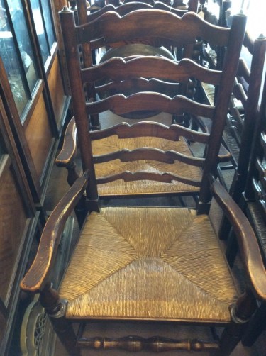 These are a set of 8 antique ladderbacks chairs rush seats in two carver chairs