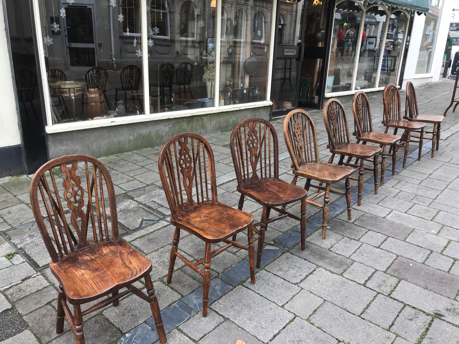 A good matched set of eight ash and one piece elm seated wheelback chair. A good colour and all with fishtail backs.